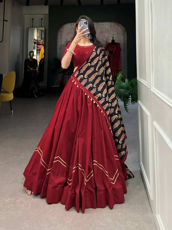 ชุดผ้าคอตตอนแท้สีแดงเข้มจากนักออกแบบใหม่พร้อม Gota patti TOUCH กระจกจริงสำหรับงานแต่งงานงานแต่ง lehenga choli