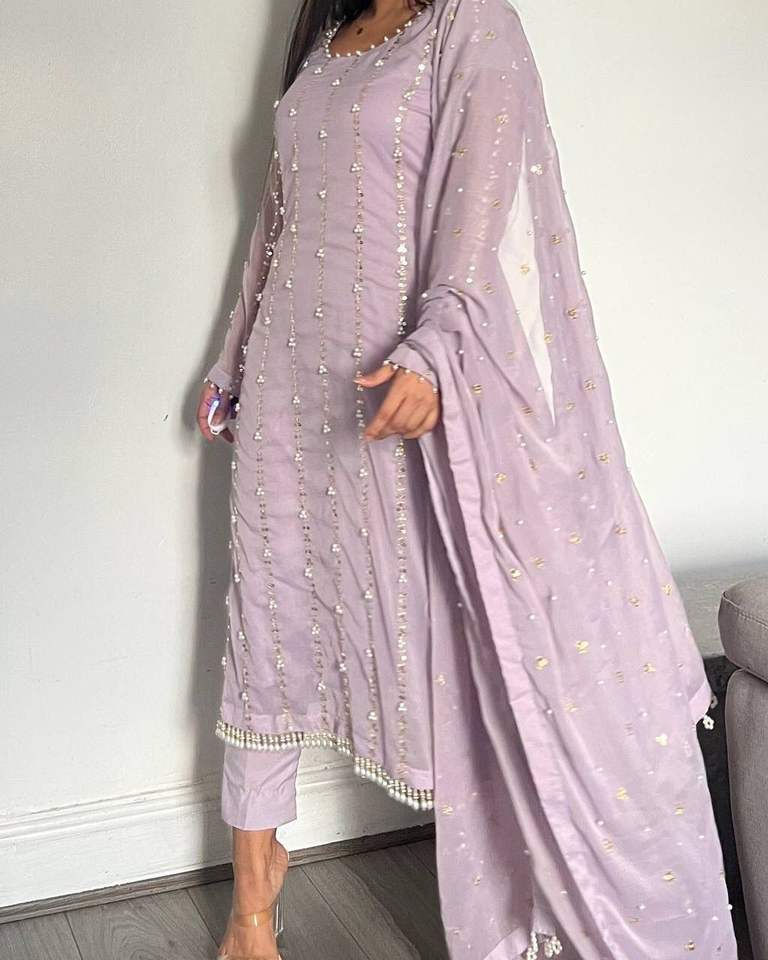 เสื้อผ้าทอลายจอร์เจ็ตเทียม ประดับหมุดมุก พร้อมกางเกงและผ้าคลุม