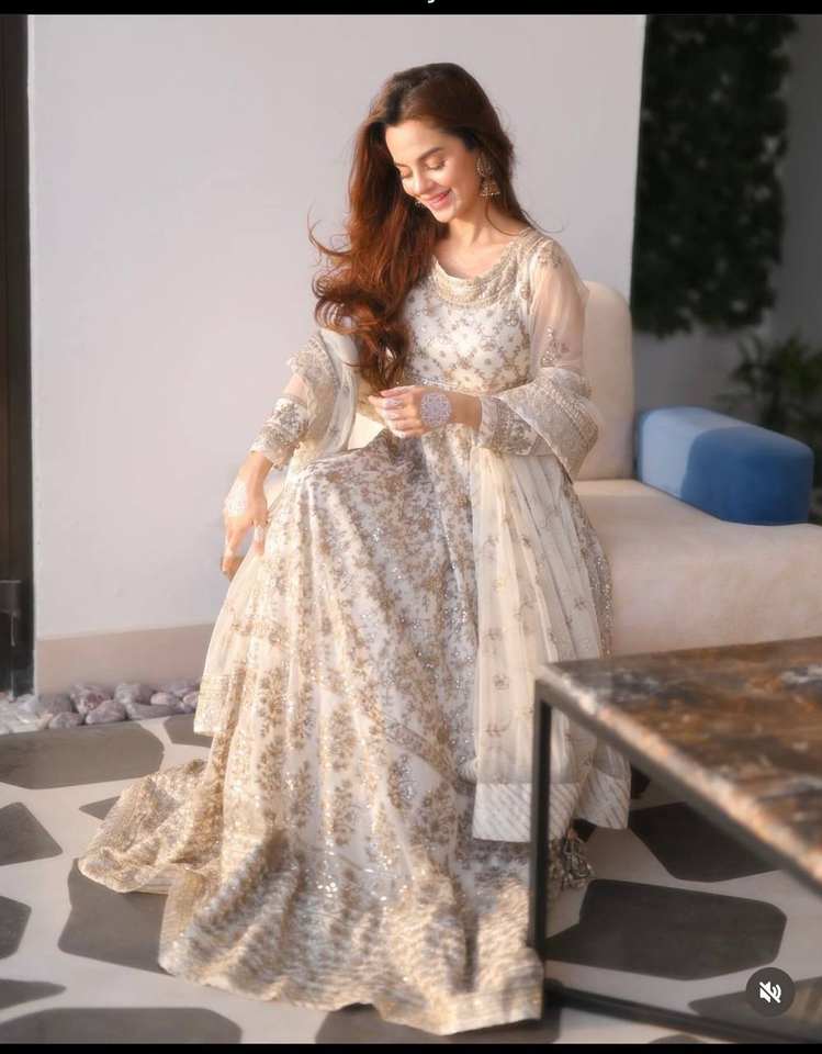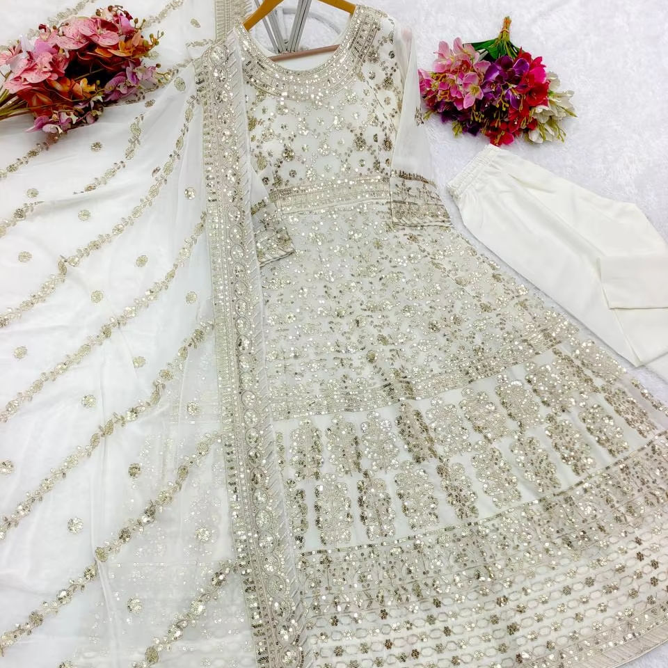 ชุดเดรสงานแต่งงานดีไซน์ใหม่สำหรับงานปาร์ตี้และงานดิวาลี พร้อมชุดกางเกงและผ้าคลุมไหล่ ผ้าฟ็อกซ์จอร์เจตต์เนื้อหนาแบบกลับด้านได้