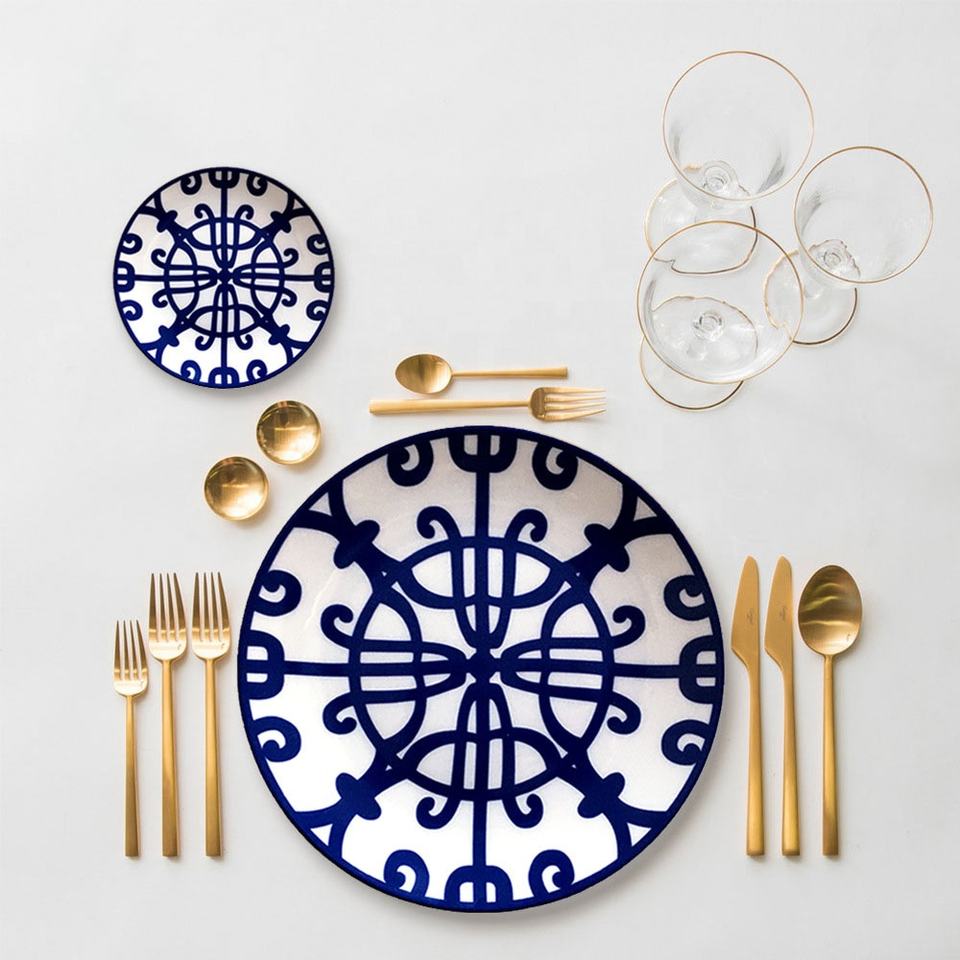 ชุดจานเซรามิกสำหรับงานแต่งงานดีไซน์ใหม่ชุดเครื่องใช้บนโต๊ะอาหารดีไซน์เหล็กดัดสีฟ้าอุปกรณ์ทานอาหารสไตล์จีน