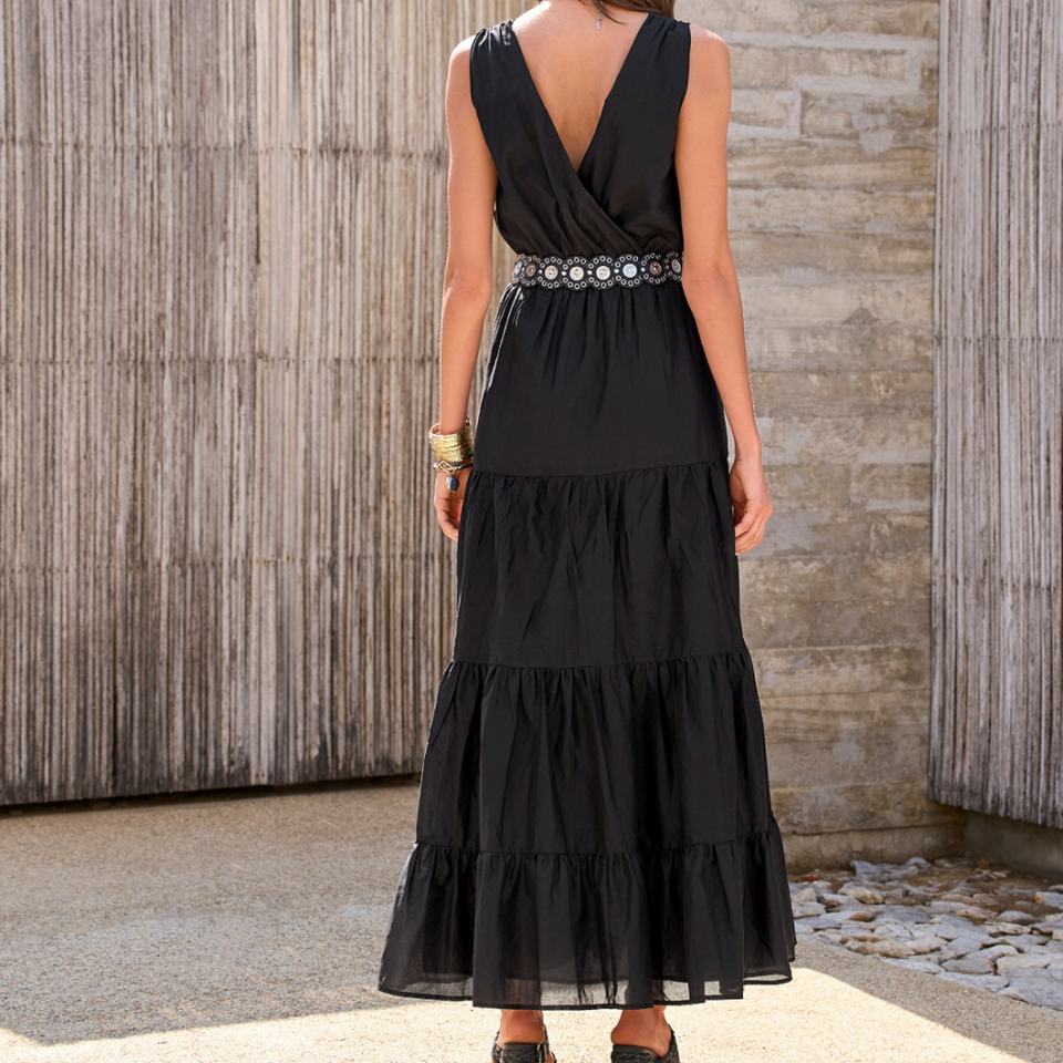 เดรสแฟชั่นใหม่ ขายส่ง เดรสยาวคอวีลึก ดีไซน์เรียบหรูสำหรับผู้หญิง เสื้อผ้าลำลองสั่งตัดได้ เดรสสีดำ
