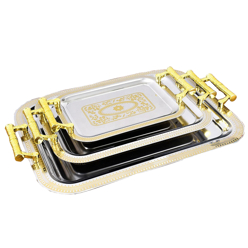 จานรองอาหารสแตนเลสสตีลรูปสี่เหลี่ยมผืนผ้าสีทองแบบใหม่ เป็นมิตรกับสิ่งแวดล้อม สำหรับงานแต่งงาน ใช้สำหรับวางอาหาร อบ และตกแต่งงานแต่งงาน