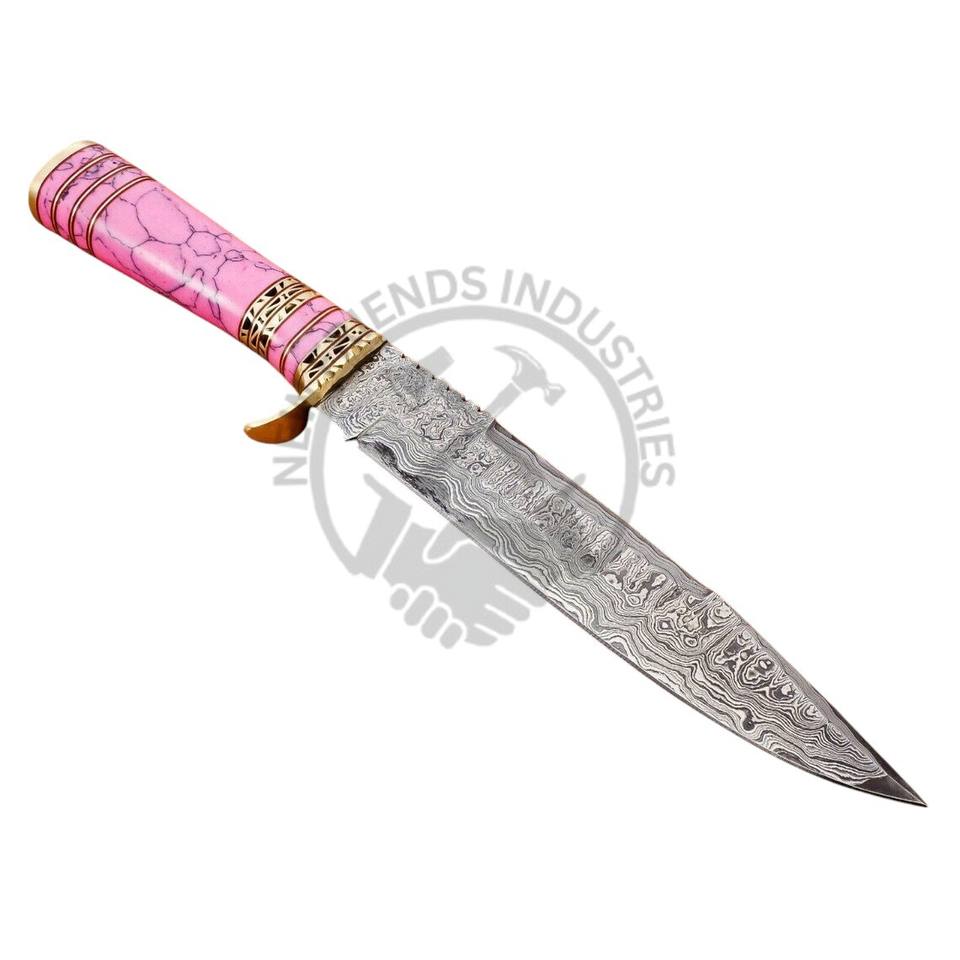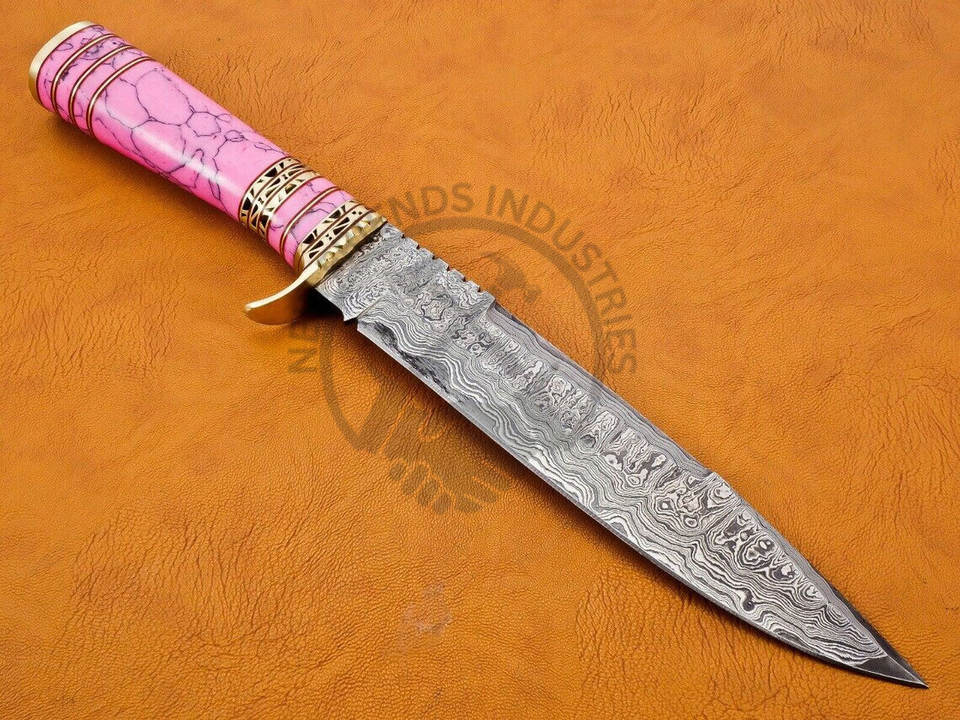 มีดโบวี่เหล็กดามัสกัสขนาด 13 นิ้ว รุ่นใหม่ ปรับแต่งได้ ด้ามทองเหลืองประดับหินสีชมพู ใบมีดคงที่ สำหรับล่าสัตว์ ตั้งแคมป์ และเอาตัวรอด