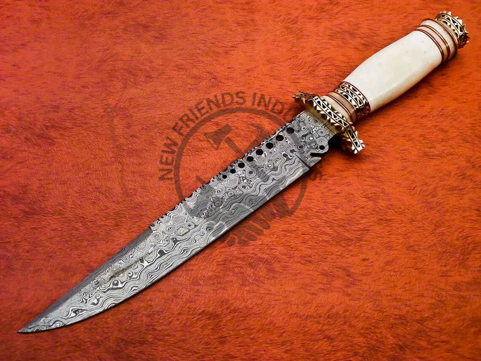 มีดโบวี่ล่าสัตว์กลางแจ้งเหล็กดามัสกัสทำมือรุ่นใหม่ปรับแต่งได้ ด้ามจับทำจากกระดูกอูฐและทองเหลือง ใช้งานได้ทั้งมือซ้ายและขวา ความแข็ง 58-60HRC คมกริบ