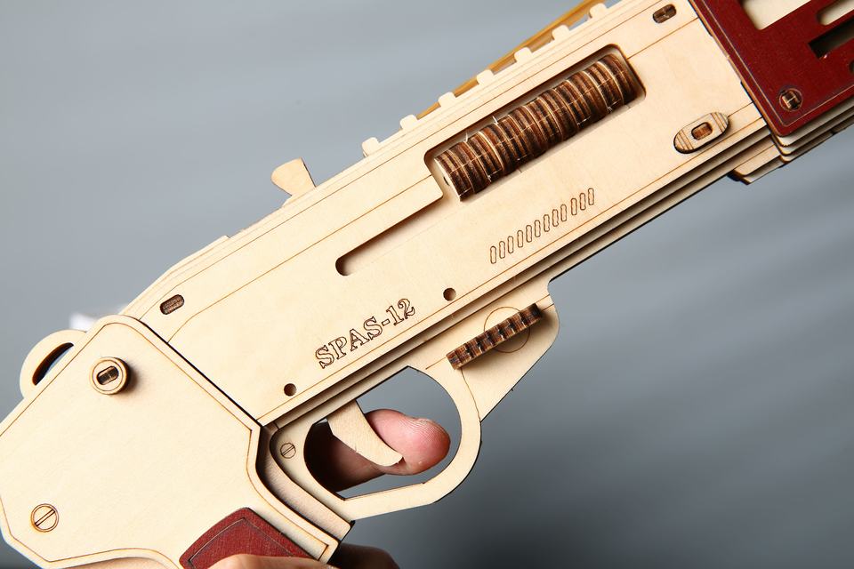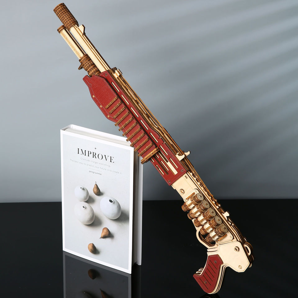 ของเล่นเสริมพัฒนาการใหม่ ของตกแต่งโต๊ะทำงาน ตัวต่อจิ๊กซอว์แบบตัดด้วยเลเซอร์ ปืนยิงยางรัดไม้ M870 ปืนลูกซอง DIY งานฝีมือไม้ ของขวัญที่ดีที่สุด