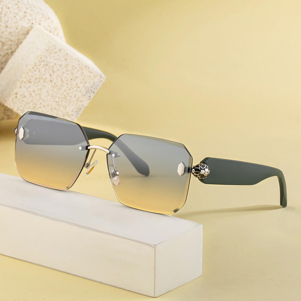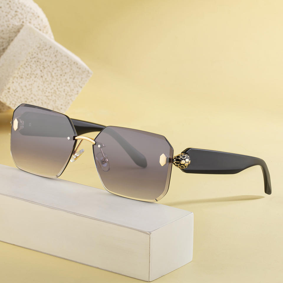 แว่นกันแดดทรงสี่เหลี่ยมแบบไร้กรอบสไตล์ยุโรปใหม่ UV400 เลนส์ PC สำหรับผู้หญิง สีดำทอง ดีไซน์หัวงู รุ่น C1 C6