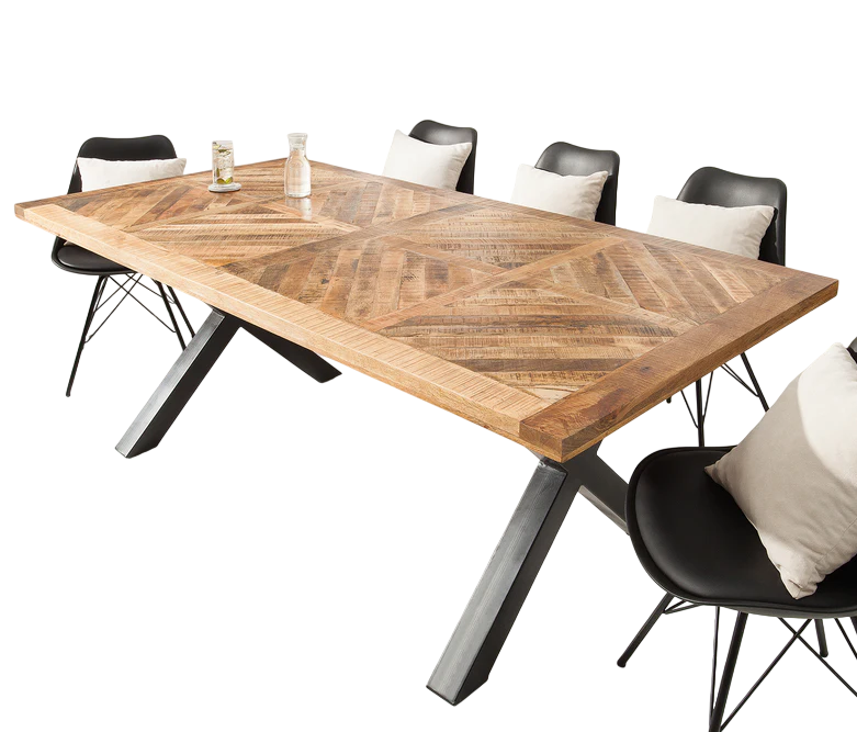 โต๊ะอาหารทรงสี่เหลี่ยมผืนผ้าไม้มะม่วงแท้สไตล์ยุโรปใหม่ ขาเหล็กพับได้รูปตัว X ทันสมัย เหมาะสำหรับบ้าน ห้องครัว สำนักงาน ร้านอาหาร