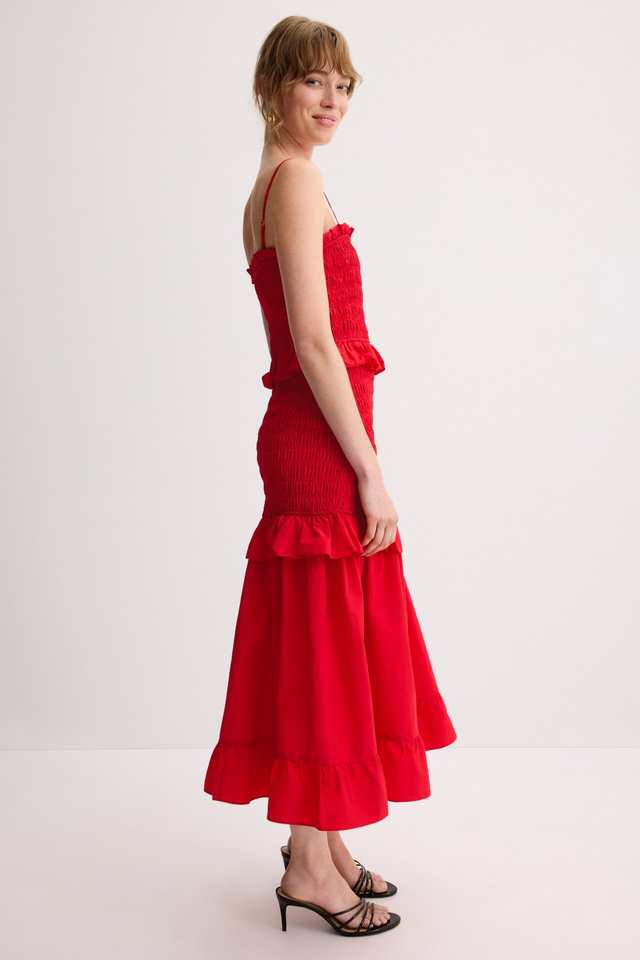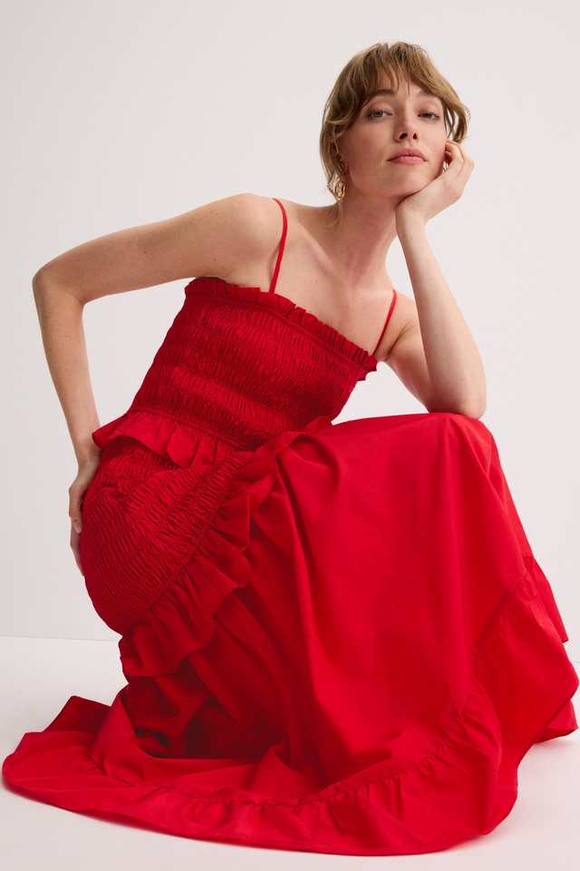 เดรสยาวสีแดงสไตล์ยุโรปและอเมริกาสำหรับผู้หญิง ดีไซน์เซ็กซี่ สายรัดเปิดโชว์สะโพก แต่งผ้าทอธรรมชาติ 100% ผ้าฝ้าย ซักได้