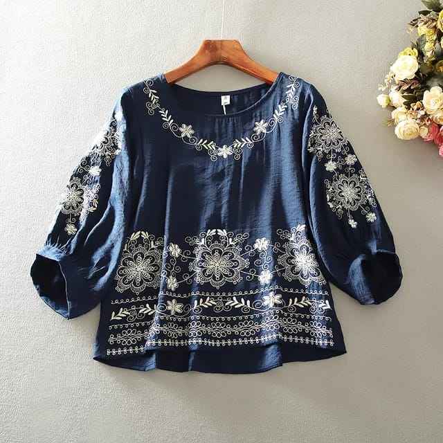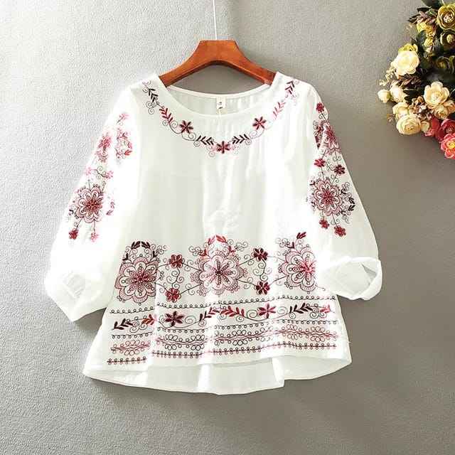 เสื้อเบลาส์แขนยาวลายปักดอกไม้สไตล์โบฮีเมียนเม็กซิกันสุดพิเศษสำหรับผู้หญิงใส่ทำงาน