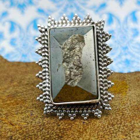 New Fancy Design 100% Genuine Pyrite Gemstone Ring Jewelry Metallic Grey Color Rectangle Shape Cabochon Gemstone Rings for Women
