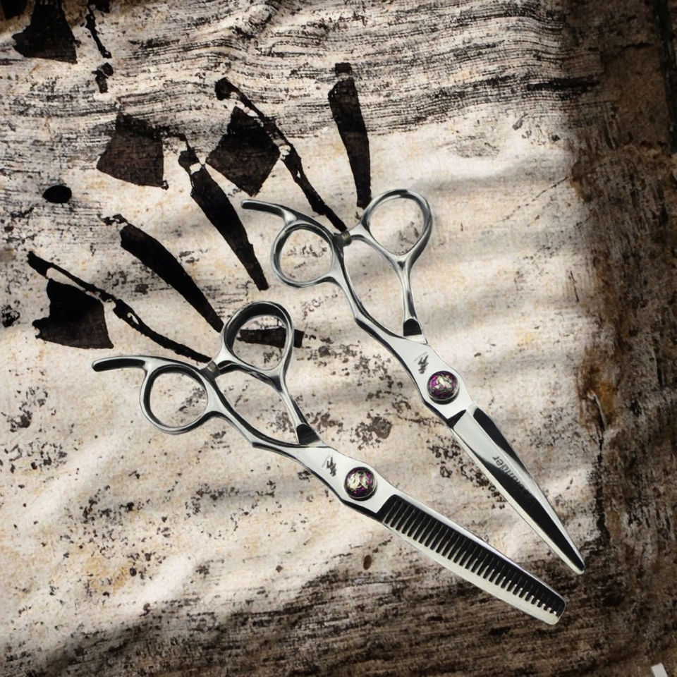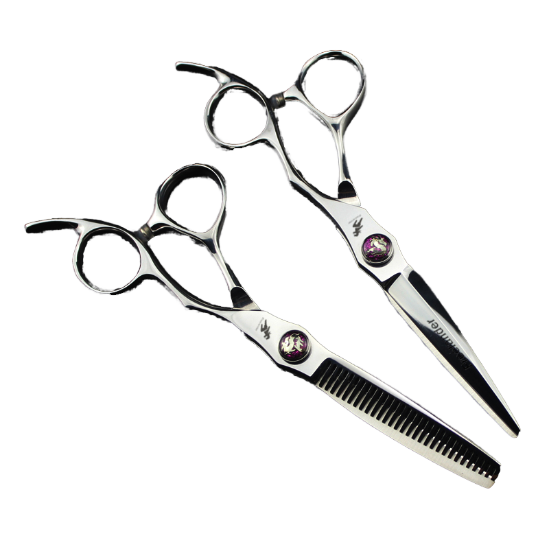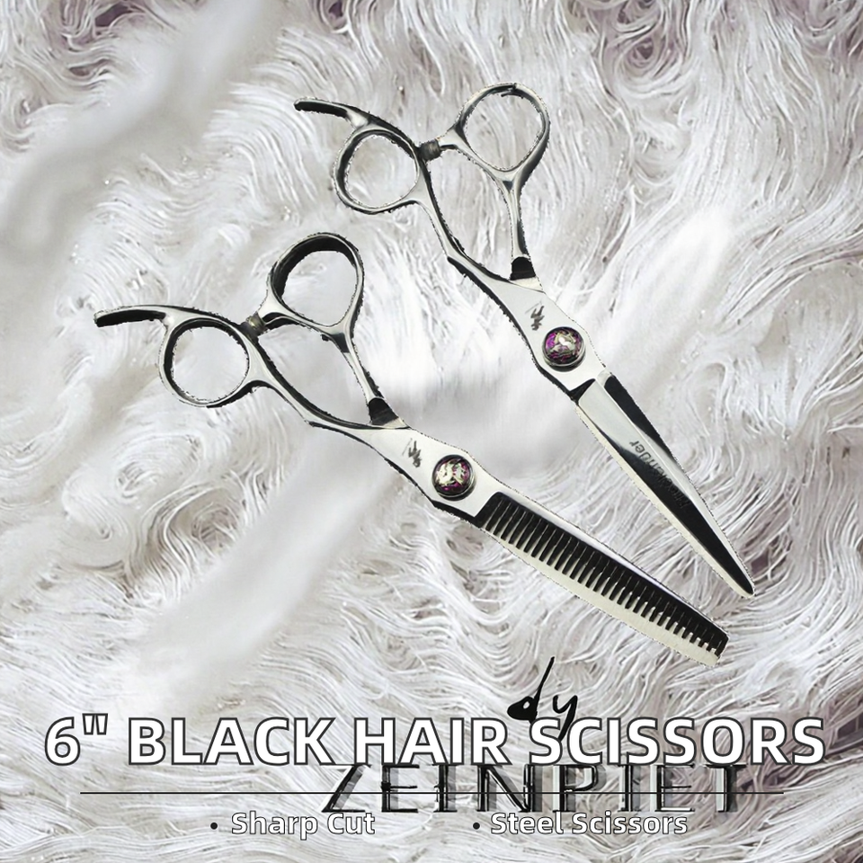 กรรไกรตัดผมสแตนเลสสตีลสีดำขนาด6.0นิ้วแบบแฟชั่นใหม่กรรไกรตัดผมแบบซี่แบนมีดีไซน์คม