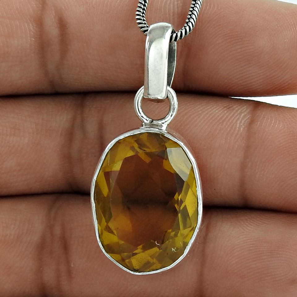 แฟชั่น925สเตอร์ลิงเงินธรรมชาติเลมอนควอตซ์ตัดอัญมณีทรงวงรีเครื่องประดับงานปาร์ตี้จี้ดูคลาสสิกทำมือ