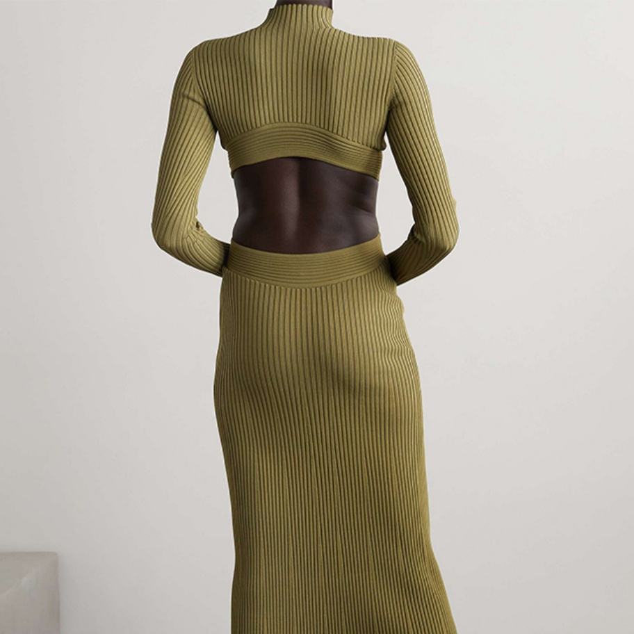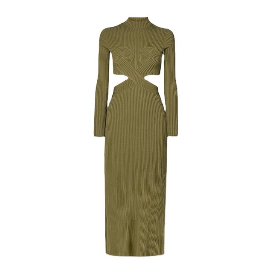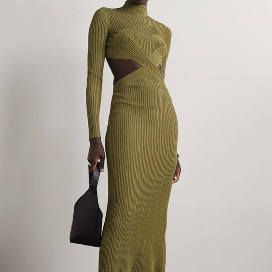 เดรสไหมพรมทรงเอ สีเขียวขี้ม้า ดีไซน์เว้าไหล่ คอวี ระบายอากาศได้ดี สไตล์ลำลอง สำหรับฤดูใบไม้ร่วง แฟชั่นใหม่