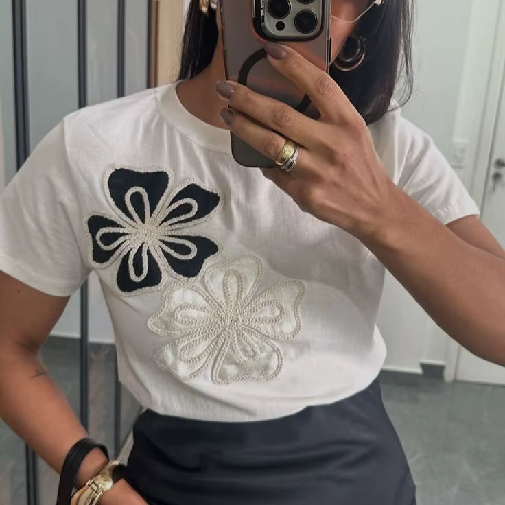 เสื้อยืดแฟชั่นใหม่ ผ้าคอตตอนเจอร์ซีย์ ผู้หญิง แขนสั้น แต่งดอกไม้ปักลายตัดกัน เสื้อครอป ผู้หญิง ฤดูร้อน สไตล์ลำลอง เสื้อยืดคอกลม