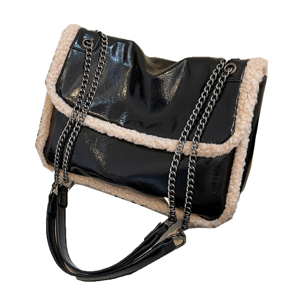 กระเป๋าโท้ทสะพายข้างโฮโบแฟชั่นใหม่หนังแกะหรูหราหนังสิทธิบัตรขนแกะดีไซน์แบบลำลองมีสายโซ่เชิงวิชาการฝาครอบซับในโพลีเอสเตอร์