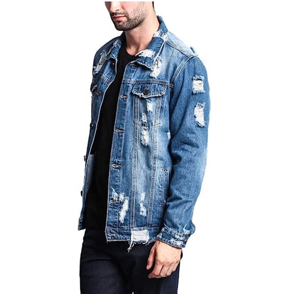 แจ็คเก็ตยีนส์ผู้ชายทรงหลวม คอตั้ง มีฮู้ด แต่งลายขาดๆ สไตล์ใหม่ พร้อมเคลือบผิวพิเศษ