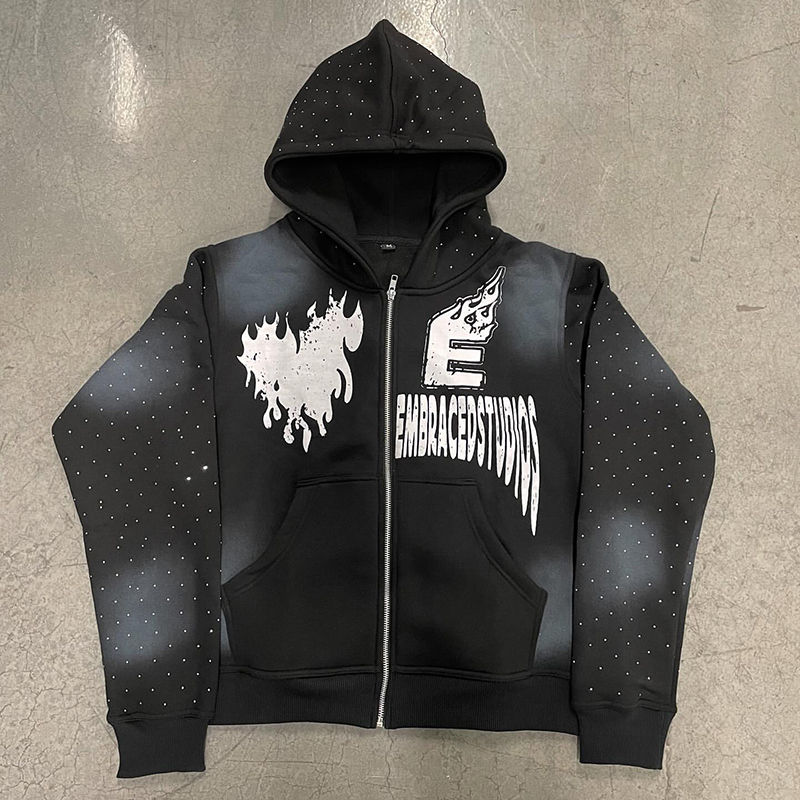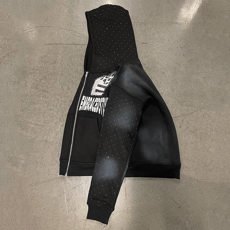 เสื้อฮู้ดมีซิปสำหรับผู้ชายแฟชั่นใหม่ล่าสุดผ้าคอตตอน100% ลายปักโลโก้ซักด้วยพลอยเทียมสไตล์ Cuffed พิมพ์ลาย