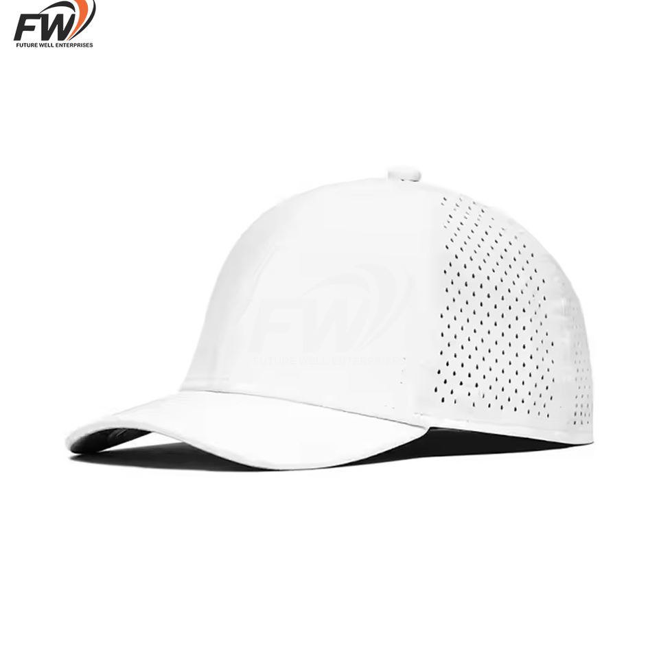 หมวกกอล์ฟกีฬาโพลีเอสเตอร์กันน้ำ 5 ชิ้นส่วน พร้อมโลโก้ป้าย PVC แบบกำหนดเองแฟชั่นใหม่, หมวกเบสบอลแบบมีรูระบายอากาศตัดด้วยเลเซอร์พร้อมเชือกแบบ Dad Hat