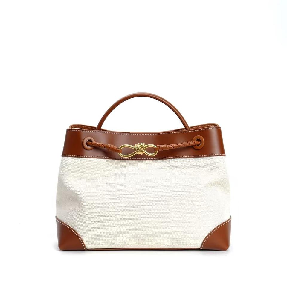 กระเป๋าถือทรงถังสะพายข้างแฟชั่นใหม่ระดับไฮเอนด์ ความจุเยอะ ผลิตจากหนังแท้และผ้าแคนวาส พร้อมดีไซน์สีตัดกันบริเวณใต้แขน