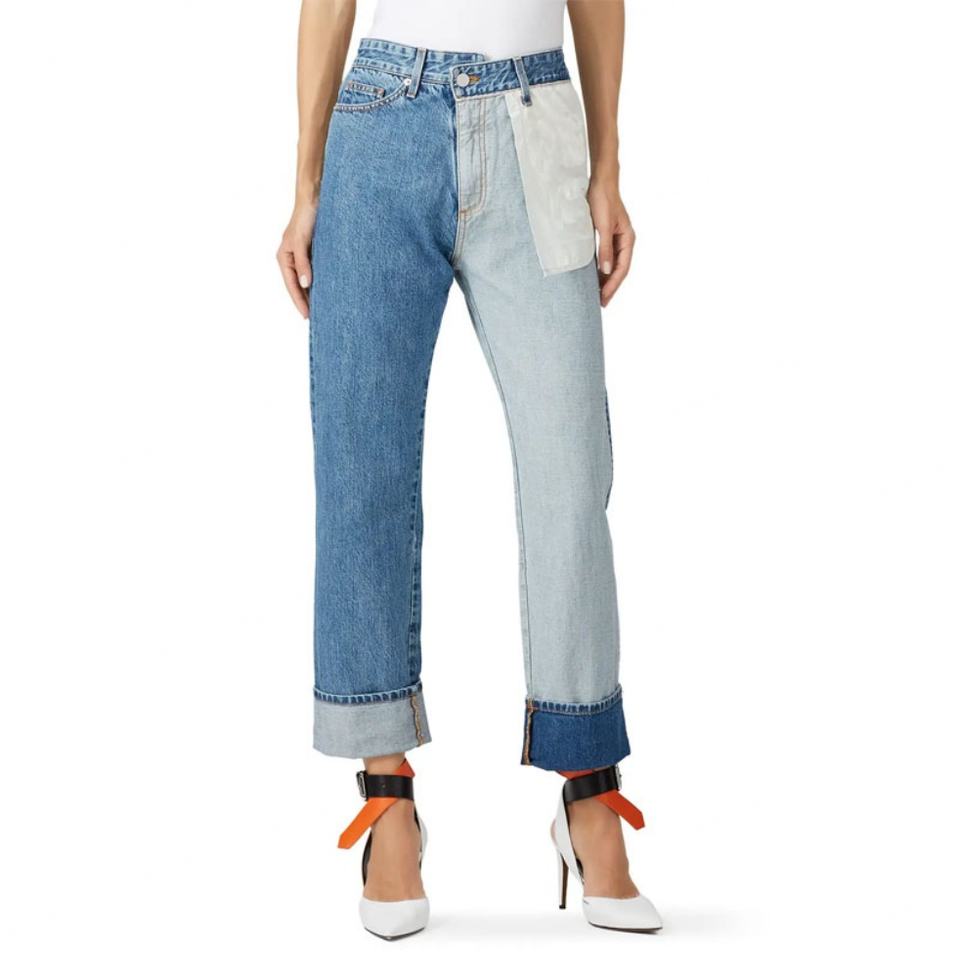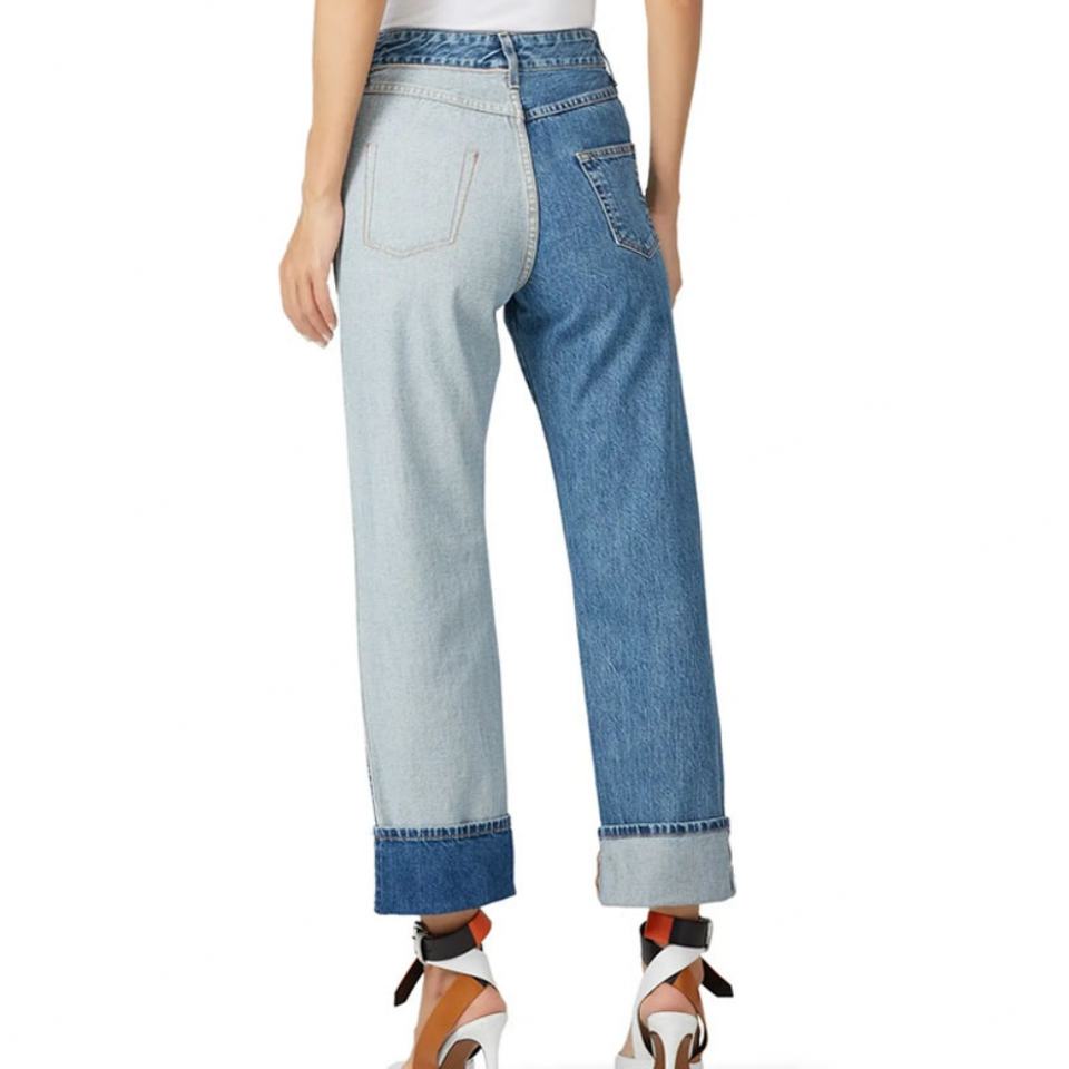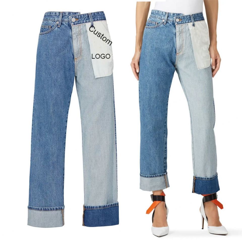 กางเกงยีนส์ทรงตรงเอวสูงแฟชั่นใหม่สีบลูวอชแบบคัลเลอร์บล็อกดีไซน์กลับด้านสำหรับผู้หญิง