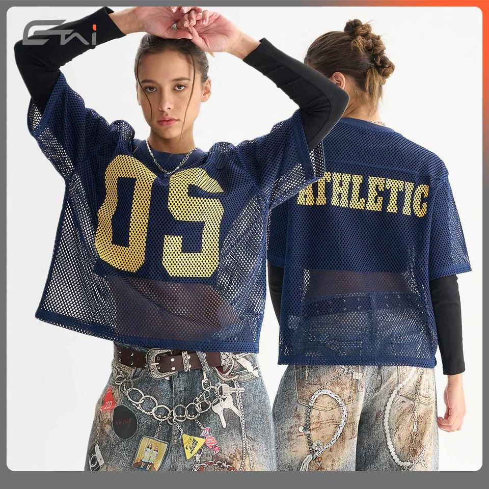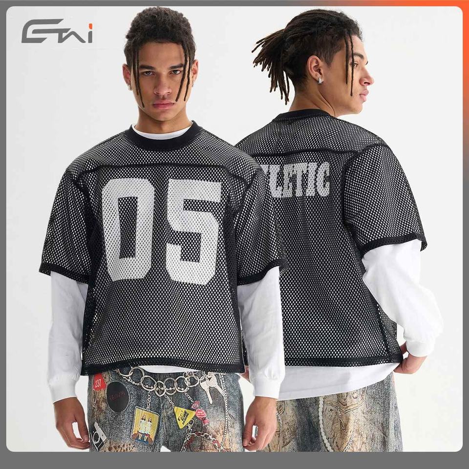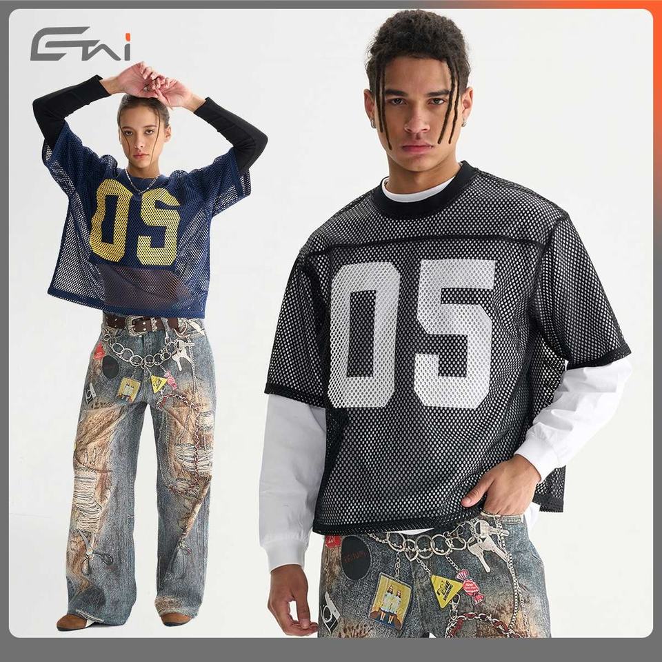 เสื้อยืดผ้าตาข่ายสำหรับผู้ชายเสื้อยืดพิมพ์ลายตัวอักษรเสื้อยืดสตรีทแบบกำหนดเองแฟชั่นใหม่