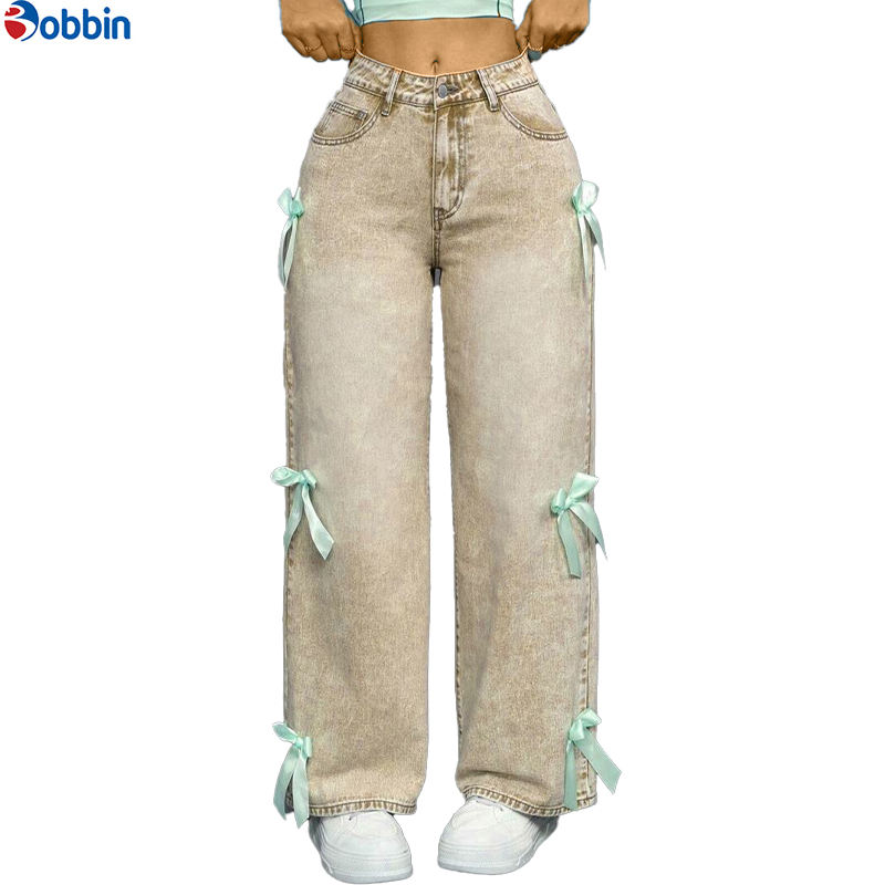 กางเกงยีนส์แฟชั่นใหม่สำหรับผู้หญิง สไตล์ใหม่ ผ้าฝ้าย ทรงขากว้าง สไตล์ลำลอง เรียบง่าย แต่งโบว์ ล้างทำความสะอาดได้ เอวสูง