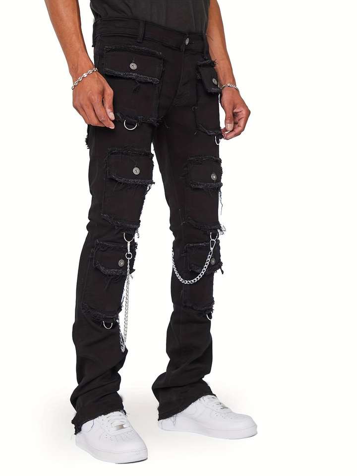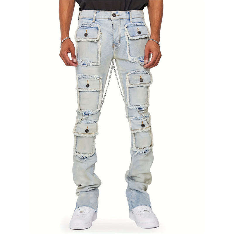 ผู้ผลิตแฟชั่นใหม่ รับผลิตกางเกงยีนส์ผู้ชายทรงตรงแบบขาดๆ รักษ์โลก ยืดหยุ่นสูง สไตล์ไฮสตรีท