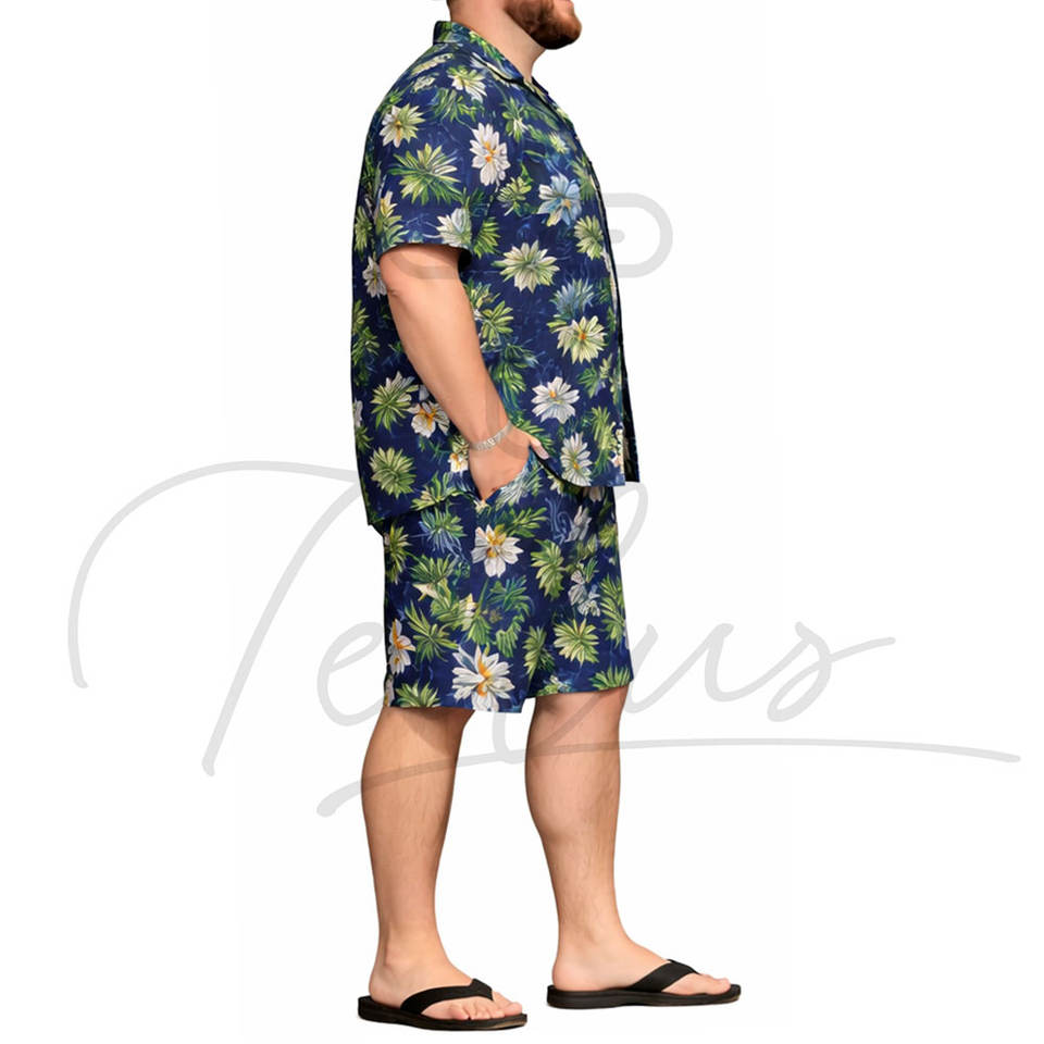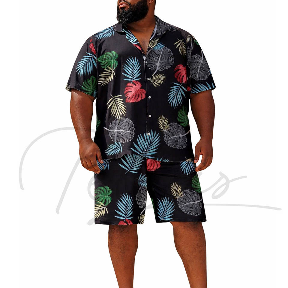 ชุดเสื้อเชิ้ตฮาวายไซส์ใหญ่แฟชั่นใหม่ ชุดลำลองผู้ชาย ลายพิมพ์ แขนสั้น เสื้อฮาวายและกางเกงขาสั้นสำหรับฤดูร้อน
