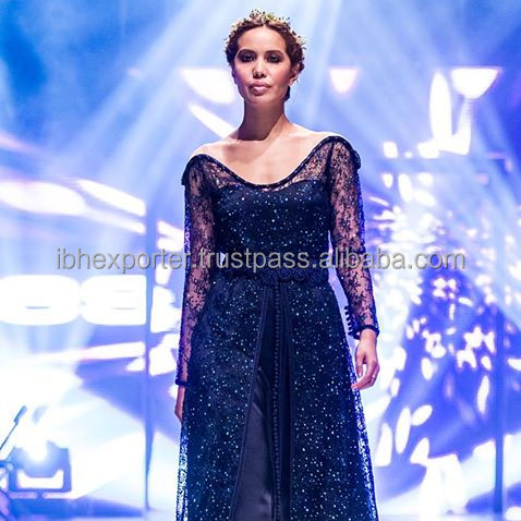 แฟชั่นโชว์ใหม่สำหรับผู้หญิง kaftan มีดีไซน์คอวีและลูกปัดสีน้ำเงินกรมท่า
