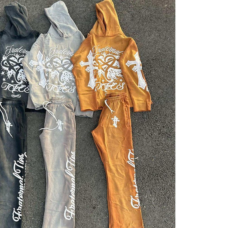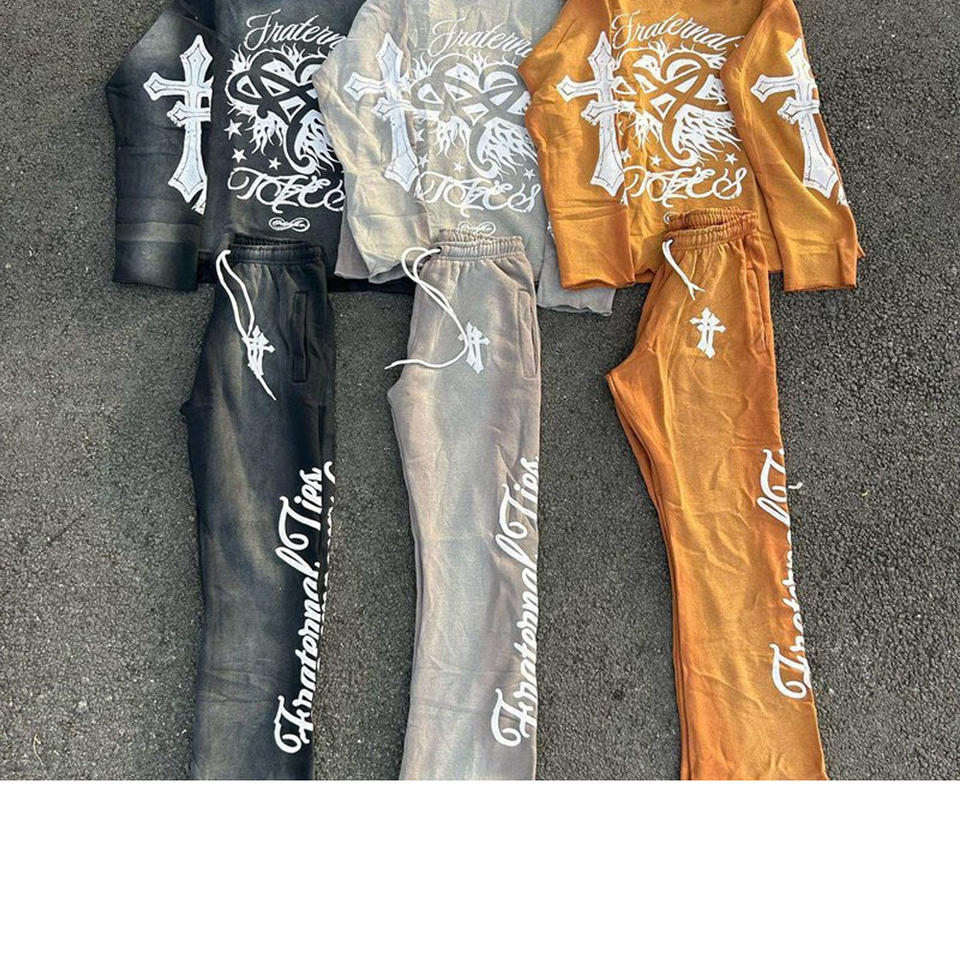 ชุดสเวตเตอร์แฟชั่นแนวสตรีทสำหรับผู้ชายพิมพ์ลายดิจิทัลวินเทจแอซิดครอปกางเกงขาบานและเซ็ตเสื้อมีฮู้ดสีซีด