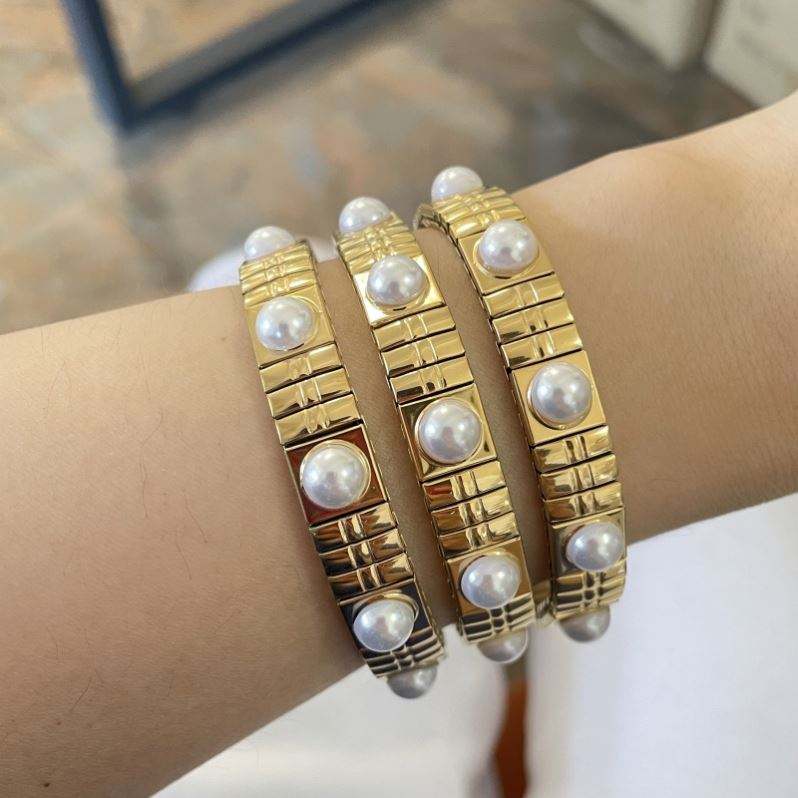 แฟชั่นใหม่กำไลข้อมือเงินมุกยืดหยุ่นสีทองทันสมัย