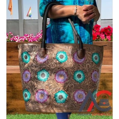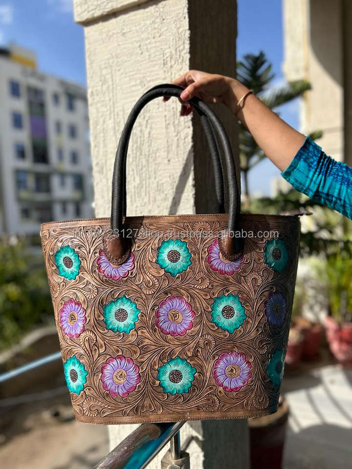 แฟชั่นใหม่กระเป๋าหนังวัวแท้ลายดอกไม้เทอร์ควอยซ์สีม่วงสำหรับผู้หญิงลายดอกไม้สไตล์ตะวันตก