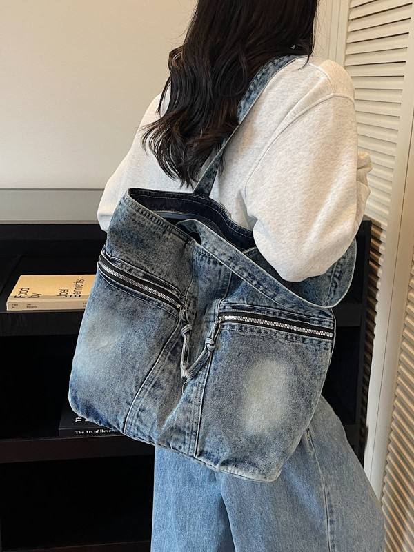 กระเป๋าโท้ทผ้าเดนิมสไตล์วินเทจลำลองแบบใหม่ ล้างสีแล้ว มีหลายช่องใส่ของ เหมาะสำหรับคุณแม่ ใช้สะพายไหล่เดียวสำหรับผู้หญิง