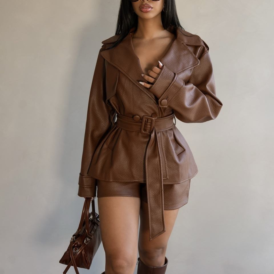 ชุดเซ็ตหนังเทียมสีน้ำตาลแฟชั่นใหม่สำหรับฤดูใบไม้ร่วงและฤดูหนาว ดีไซน์เก๋ เซ็กซี่ สบายๆ แจ็คเก็ตหนังยาวปานกลาง พร้อมกางเกงขาสั้นสไตล์ไบค์เกอร์