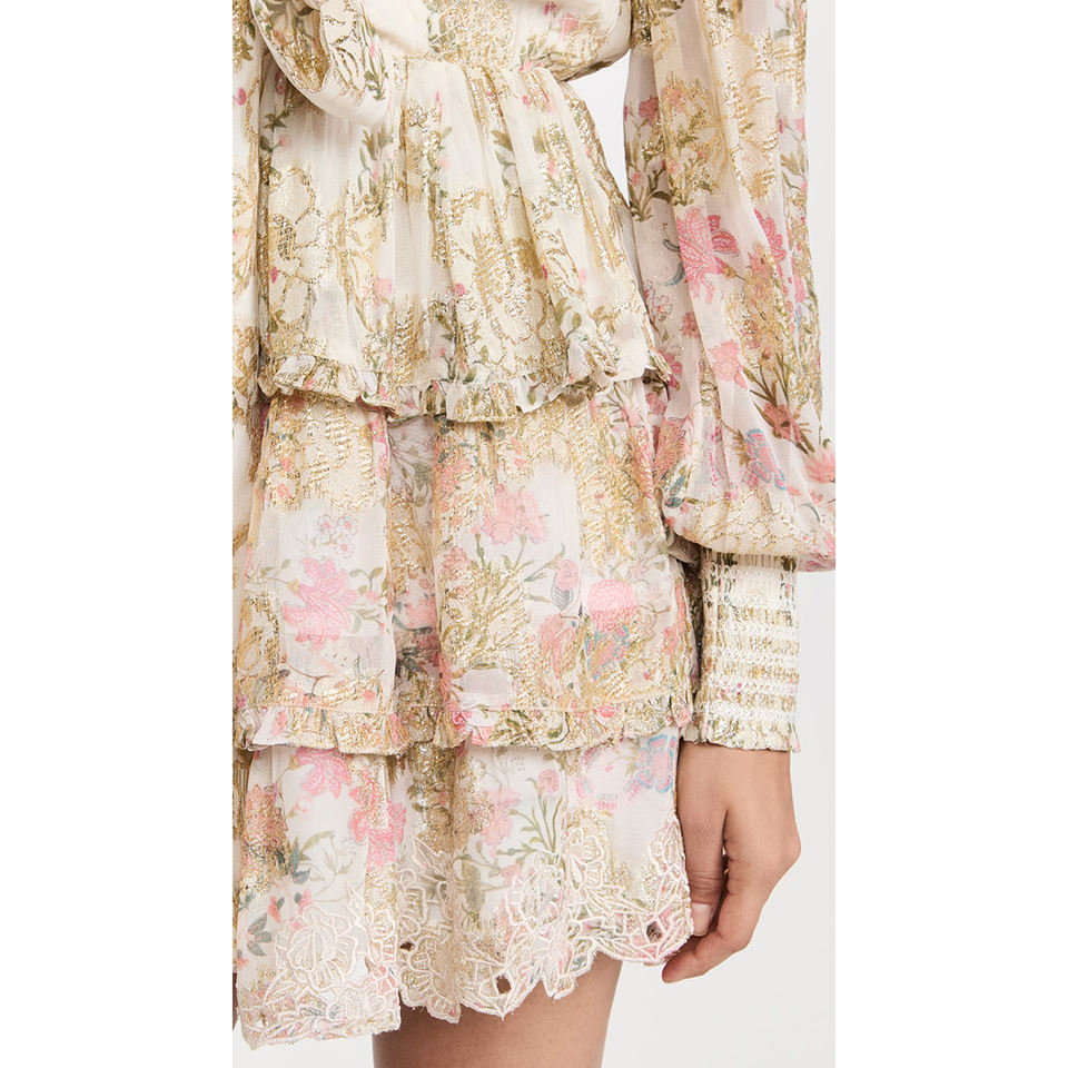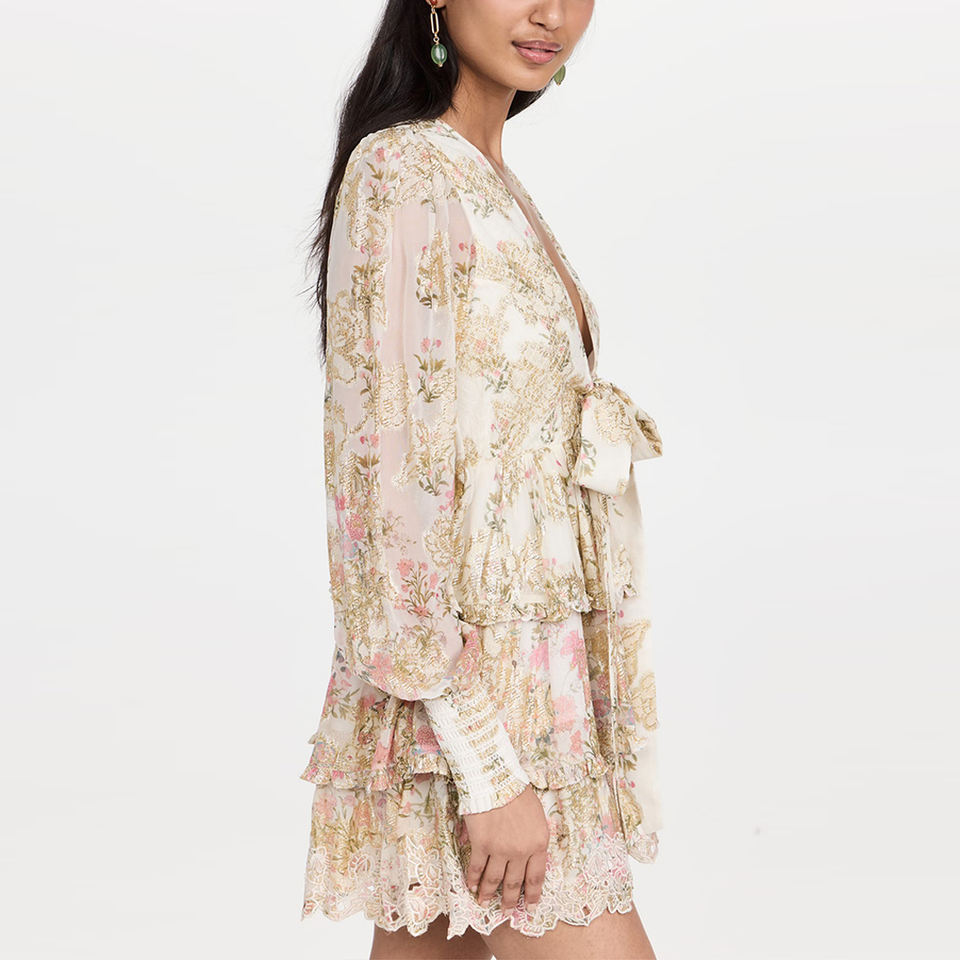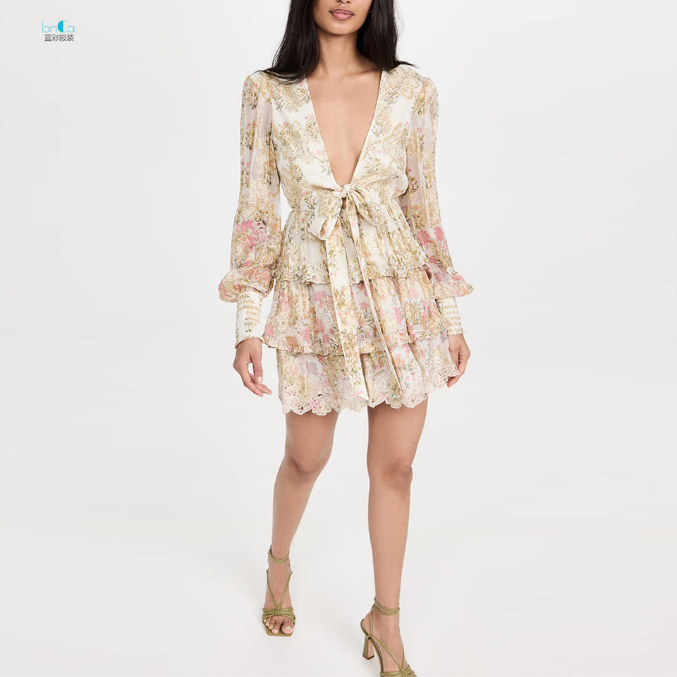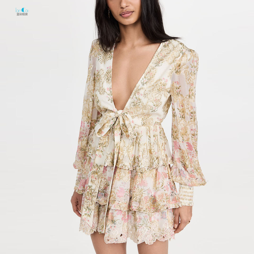 ชุดเดรสแขนยาวสำหรับผู้หญิงแฟชั่นใหม่ชุดเดรสออกงานปาร์ตี้ลำลองคอวีแต่งระบายหรูหรา