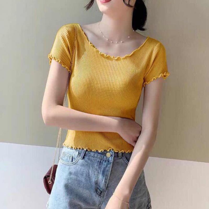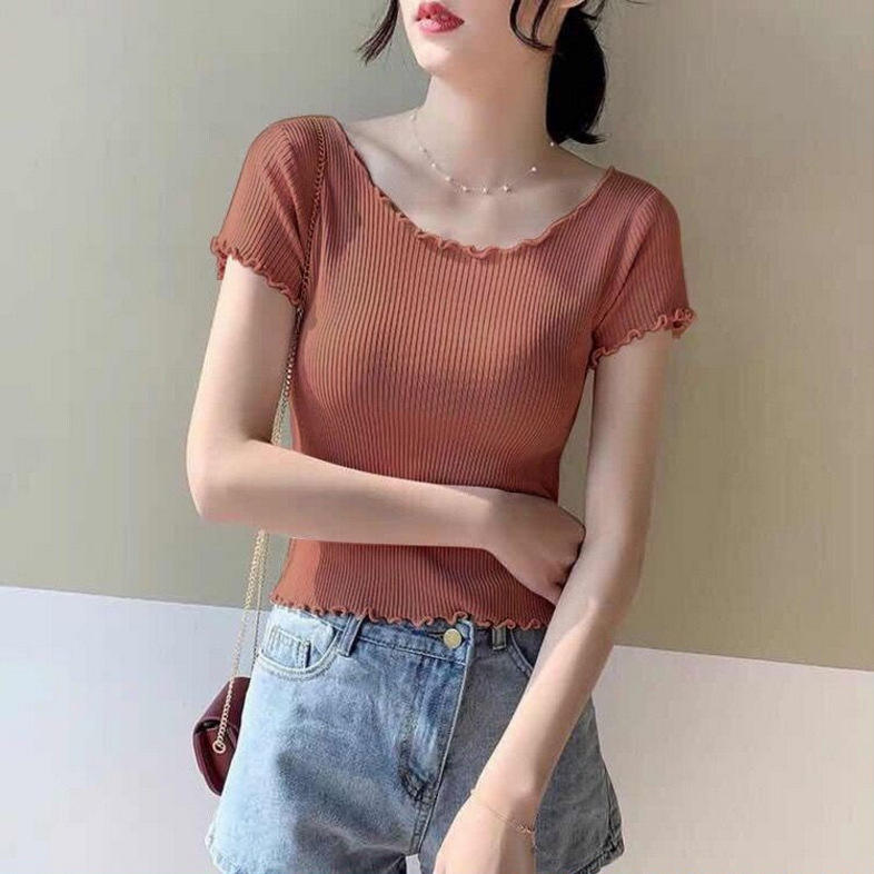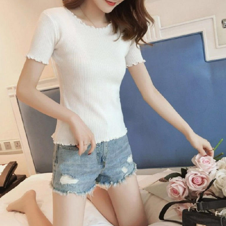 New Fashion Women Girls Summer Knit Wavy Edge Short Tops O-neck Short Sleeve Slim Solid Color T-shirt