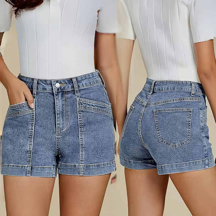 กางเกงยีนส์ขาสั้นเอวสูงแฟชั่นใหม่สำหรับผู้หญิง ฤดูร้อน กระดุมซิป ทรงเข้ารูป มีกระเป๋า สีน้ำเงินล้วน