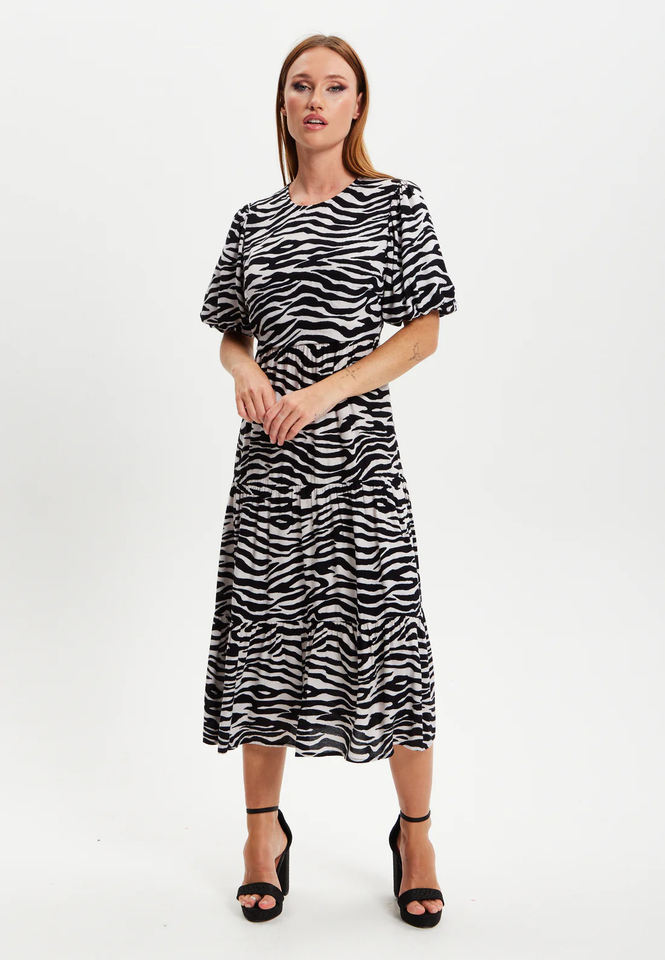 เดรสคลุมเข่าวิสคอสเปิดหลังพิมพ์ลายม้าลายออกแบบได้ตามสมัยนิยม