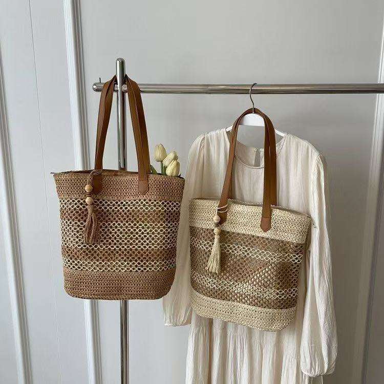 กระเป๋าสะพายไหล่ผู้หญิงทรงใหม่ทันสมัย ดีไซน์โปร่งลายสีตัดกัน ตกแต่งพู่ถักจากหญ้า พร้อมซิปปิด เหมาะสำหรับการเดินทางช่วงฤดูร้อนและชีวิตประจำวัน