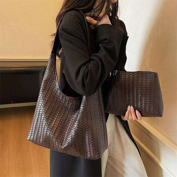 ชุดกระเป๋าถือผู้หญิงสองชิ้น วัสดุ PU ทอแบบวินเทจใหม่ ทันสมัย ปิดด้วยซิป ใช้งานได้หลากหลาย ฤดูใบไม้ผลิ/ฤดูหนาว/ทุกฤดู เหมาะสำหรับเดินทางและช้อปปิ้ง