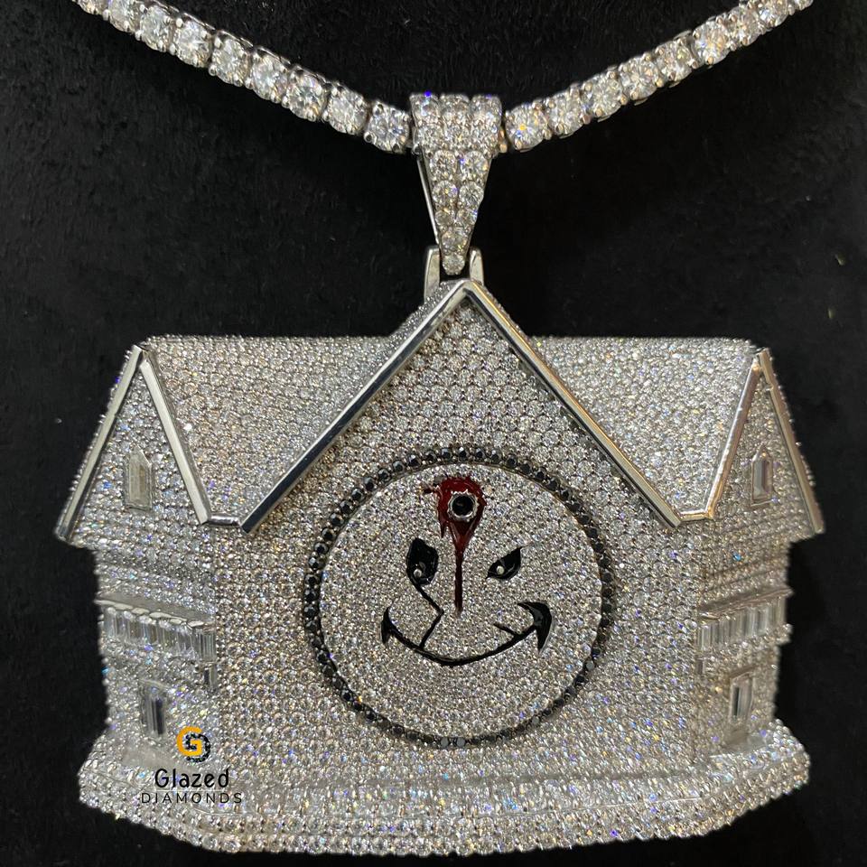 จี้เพชร VVS คุณภาพสูงทรงใหม่ทันสมัย ประดับเพชรไร้สีแบบเต็มตัว ชุบโรเดียม สไตล์ฮิปฮอป แทร็ปเฮาส์ ทองคำขาว 10K สำหรับงานปาร์ตี้
