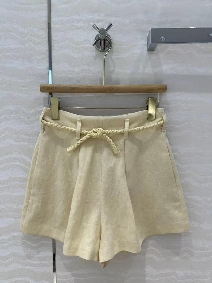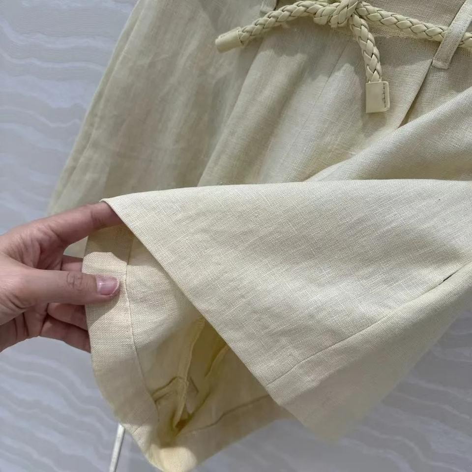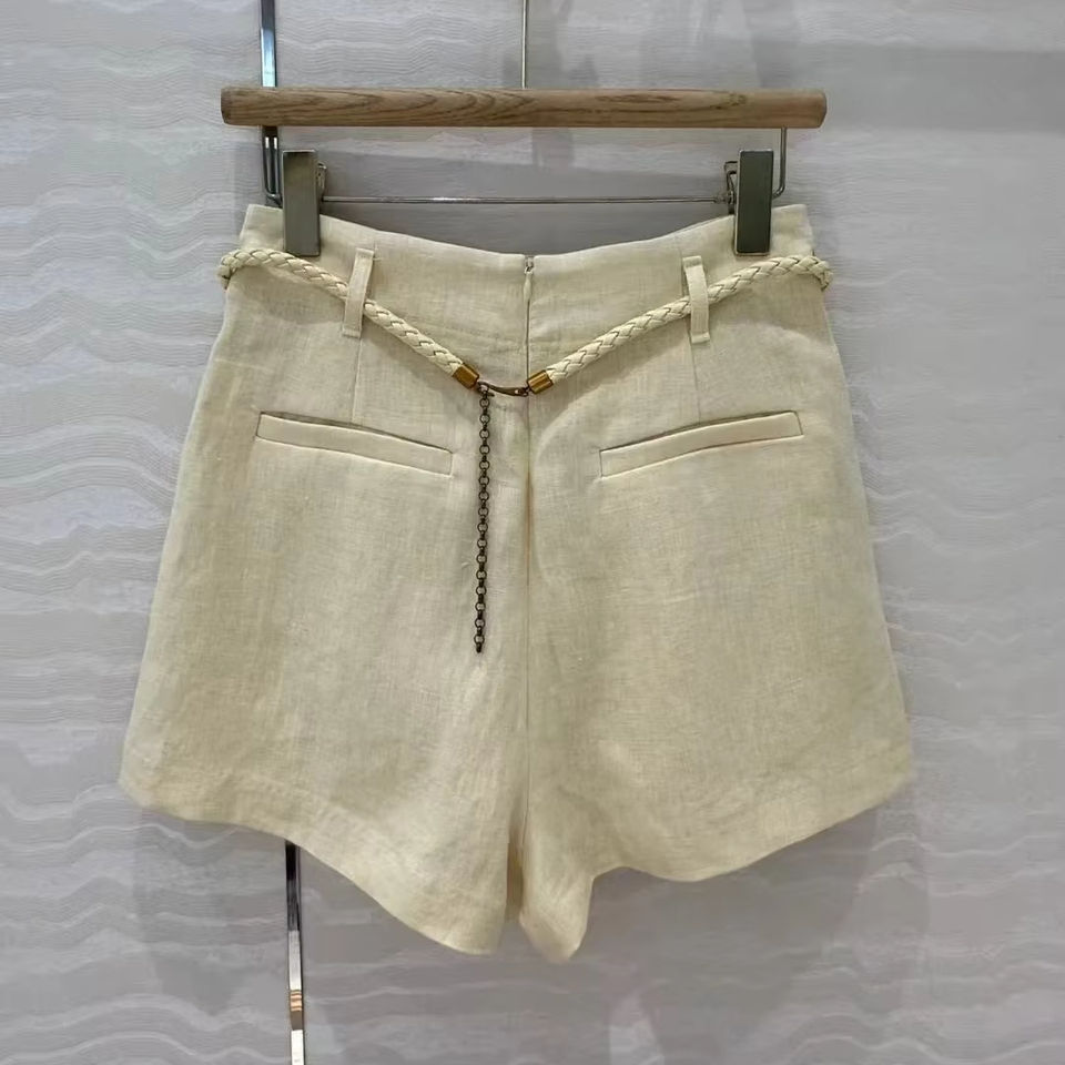 กางเกงขาสั้นผ้าลินินเอวสูงดีไซน์เข็มขัดทอผ้าเรียบง่ายแฟชั่นใหม่