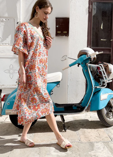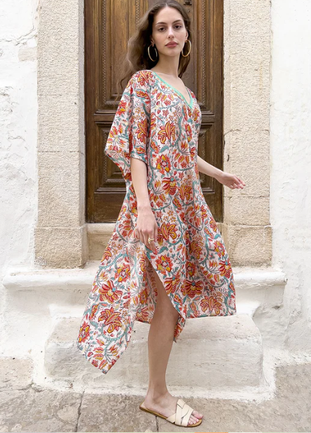 ชุดเดรสชายหาดผ้าคอตตอนมัดย้อมแขนสั้นเสื้อกิโมโนสไตล์โบฮีเมียน