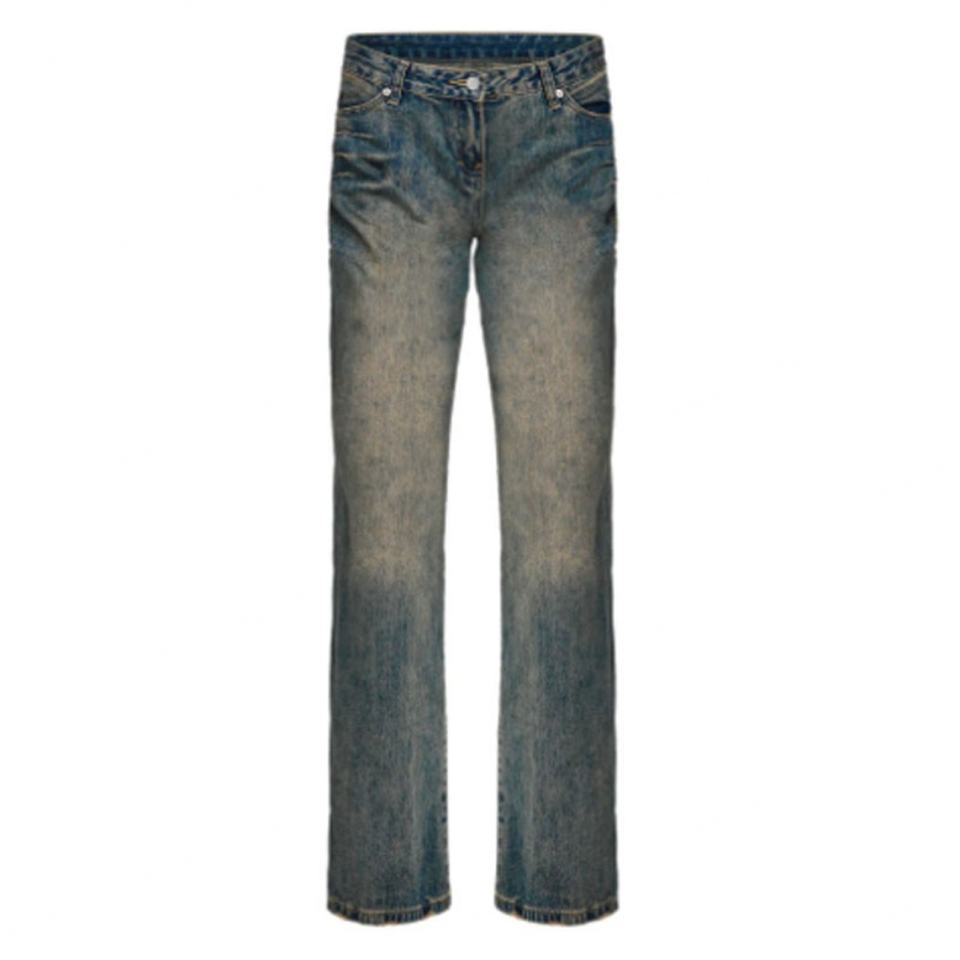 กางเกงยีนส์เดนิมสีน้ำเงินเอวต่ำพิเศษสำหรับผู้หญิง ดีไซน์ใหม่พร้อมรายละเอียดการขัดทรายแบบเบา
