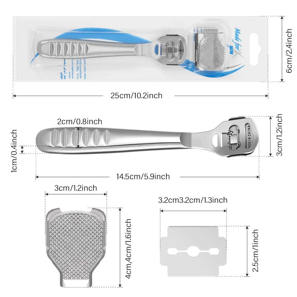 เครื่องมือดูแลเท้าใหม่ สแตนเลสสตีล 1 ชิ้น เครื่องขูดหนังด้าน กำจัดหนังกำพร้า ที่โกนหนังเท้า + ใบมีด 50 ชิ้น