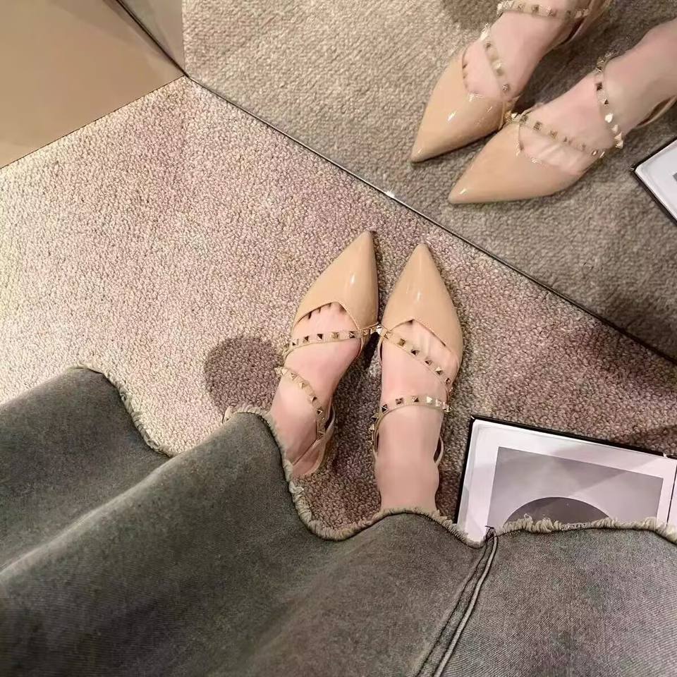 รองเท้าส้นสูงหนังแท้สไตล์ฝรั่งเศสแบบใหม่ สวมใส่สบาย ปลายแหลม ส้นบาง ประดับกระดุมสี่เหลี่ยมและคริสตัล เหมาะสำหรับงานแต่งงาน วัสดุยาง
