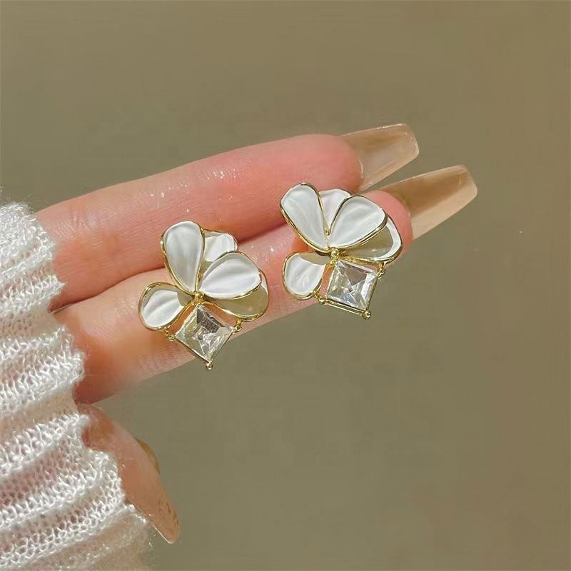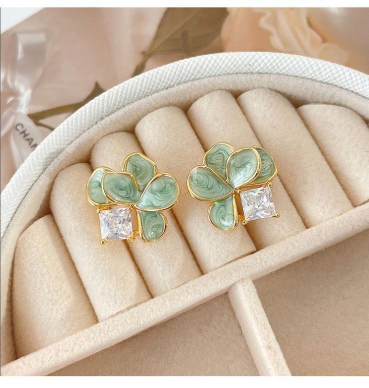 ต่างหูแบบติดหู ดีไซน์กลีบดอกคามิลเลียสีเขียวขาวสไตล์ฝรั่งเศสใหม่ ประดับเพชร ชุบทอง ทำจากโลหะผสมสังกะสี ดีไซน์เก๋ไก๋สไตล์เรโทรสำหรับผู้หญิง