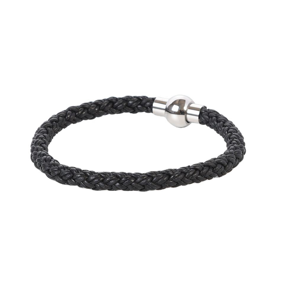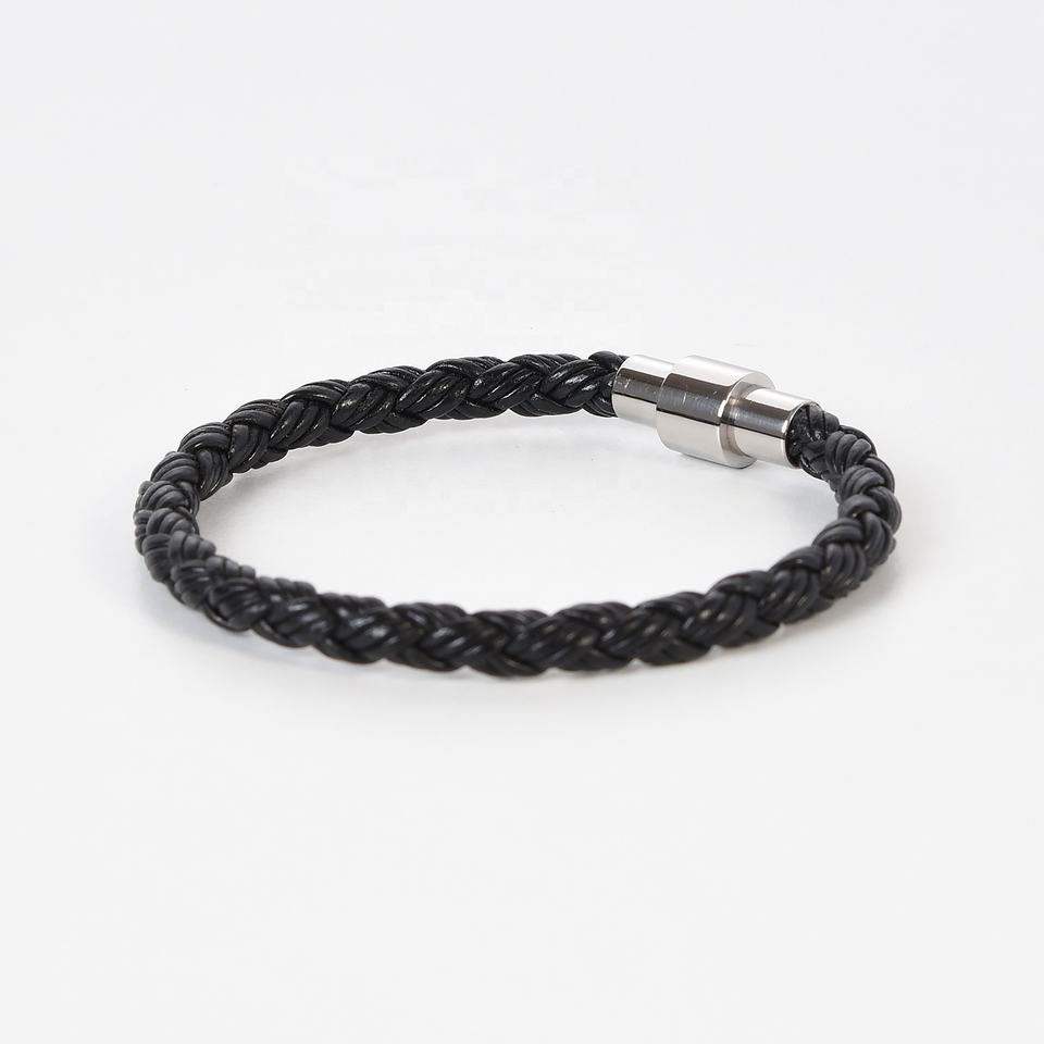 สร้อยข้อมือหนังทรงกลมสีดำพร้อมตะขอแม่เหล็กเงินสเตอร์ลิงสำหรับสุภาพบุรุษ