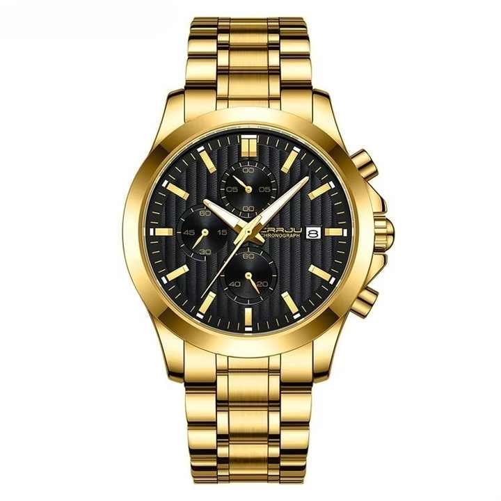 นาฬิกาข้อมือผู้ชายโครโนกราฟสแตนเลสสตีลสีทองใหม่ กันน้ำ 3BAR พร้อมเข็มเรืองแสง HD ฟังก์ชั่นหลากหลาย นาฬิกาควอตซ์สำหรับนักธุรกิจ