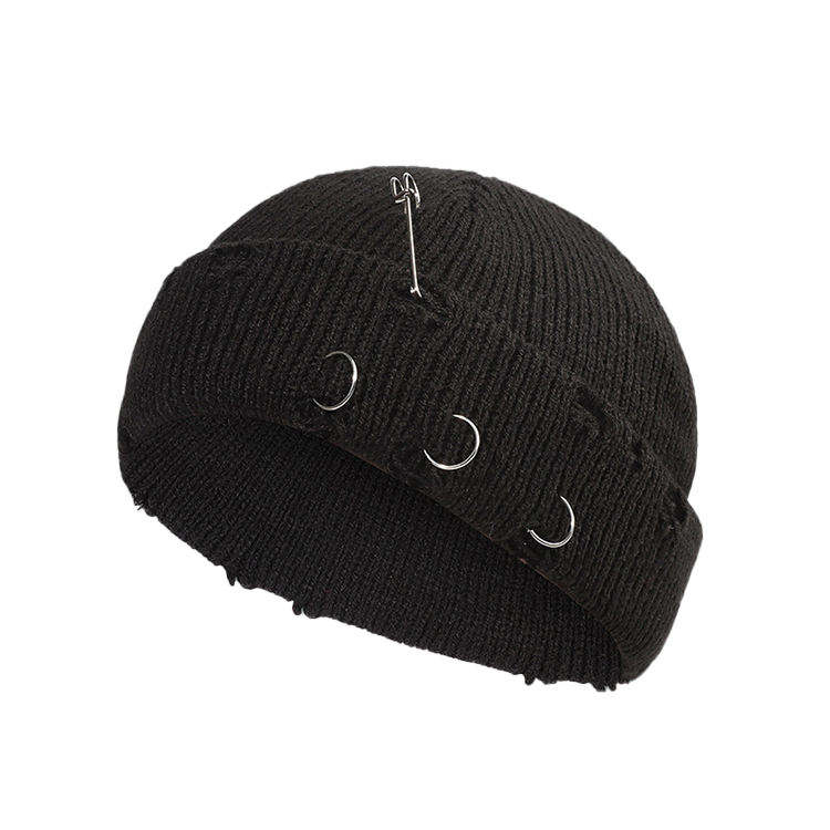 หมวกบีนนี่สไตล์โกธิคแบบใหม่ แต่งลายขาดๆ สำหรับฤดูหนาว หมวกไหมพรมอุ่นๆ แต่งห่วงโลหะสุดเทรนดี้ สไตล์ฮิปฮอป ลายหัวกะโหลก